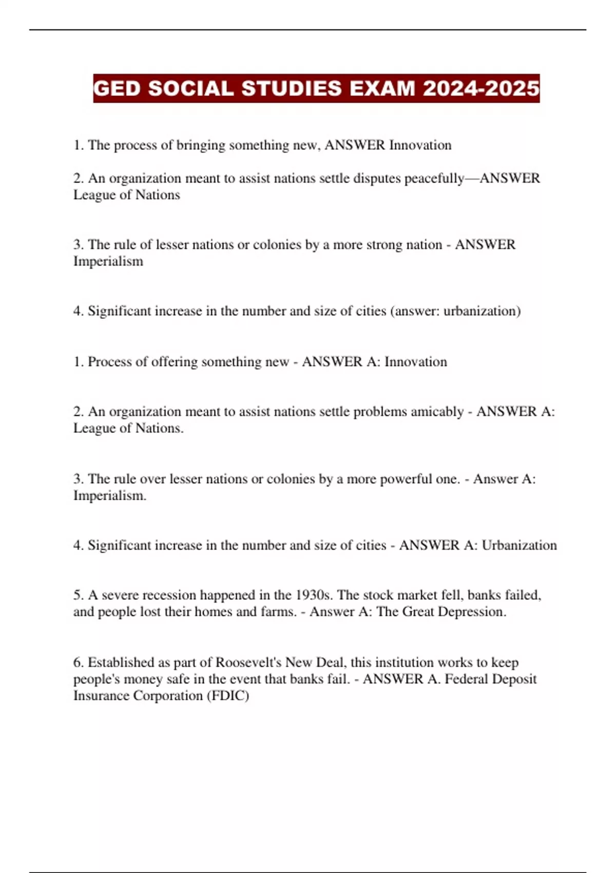 GED SOCIAL STUDIES EXAM 2024- 2025 1. The process of bringing something new, ANSWER Innovation 2. An organization meant to assist nations settle disputes peacefully —ANSWER League of Nations 3. The rule of lesser nations or colonies by a more strong nation - ANS WER Imperialism 4. Significant increase in the number and size of cities (answer: urbanization) 1. Process of offering something new - ANSWER A: Innovation 2. An organization meant to assist nations settle problems amicably - ANSWE R A: League of Nations. 3. The rule over lesser nations or colonies by a more powerful one. - Answer A: Imperialism. 4. Significant increase in the number and size of cities - ANSWER A: Urbanizat ion 5. A severe recession happened in the 1930s. The stock market fell, banks failed, and people lost their homes and farms. - Answer A: The Great Depression. 6. Established as part of Roosevelt's New Deal, this institution wo rks to keep people's money safe in the event that banks fail. - ANSWER A. Federal Deposit Insurance Corporation (FDIC) 7. A battle between the early North and South states from 1861 to 1865. Eight upper Southern states were "Union" and seven lower Southern states were Confederate. - Answer A: Civil War. 8. A period of prosperity and progress preceding the Great Depression. - Ans wer A: Roaring Twenties. 9. Individuals, households, corporations, and industries all get economic information and make decisions at the individual or company level. - Answ er A: Microeconomics. 10. A fee imposed to borrow money - ANSWER A: Interest. 11. In 1803, France sold this region to the United States. This territo ry lay between the Mississippi River and the Rocky Mountains. So, what was this called? - An swer A. Louisiana Purchase 12. Machines supplanted hand tools used in the fabrication of items . People fled the farms to work in industries. - Answer A: Industrial Revolution. 13. A power provided to citizens allowing them to reject legislation pas sed by the legislature or voters by obtaining signatures. - ANSWER A Referendum 14. Taking over another country or area. - ANSWER A: Annexatio n 15. Classes that dictated a person's career and social status. - Answer A : Castes. 16. People who desired to stop slavery: ANSWER A. Abolitionists.