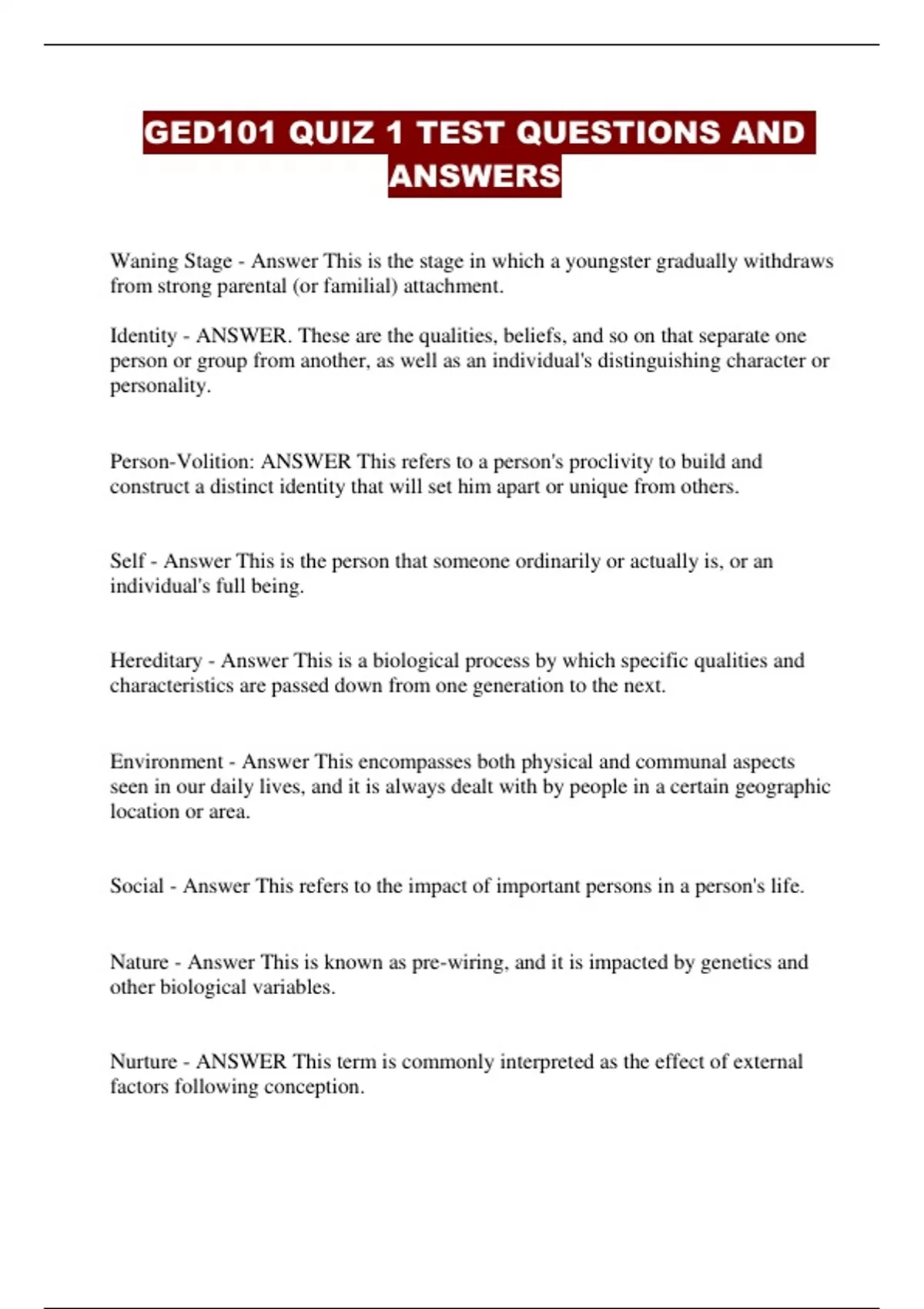 GED101 QUIZ 1 TEST QUESTIONS AND ANSWERS Waning Stage - Answer This is the stage in which a youngster gradually wit hdraws from strong parental (or familial) attachment. Identity - ANSWER. These are the qualities, beliefs, and so on that separate one person or group from another, as well as an individual's distinguishing c haracter or personality. Person-Volition: ANSWER This refers to a person's proclivity to build an d construct a distinct identity that will set him apart or unique from others . Self - Answer This is the person that someone ordinarily or actually is, or an individual's full being. Hereditary - Answer This is a biological process by which specific q ualities and characteristics are passed down from one generation to the next. Environment - Answer This encompasses both physical and communal aspect s seen in our daily lives, and it is always dealt with by people in a certain geographic location or area. Social - Answer This refers to the impact of important persons in a person's life. Nature - Answer This is known as pre-wiring, and it is impacted by genetic s and other biological variables. Nurture - ANSWER This term is commonly interpreted as the effect of external factors following conception.