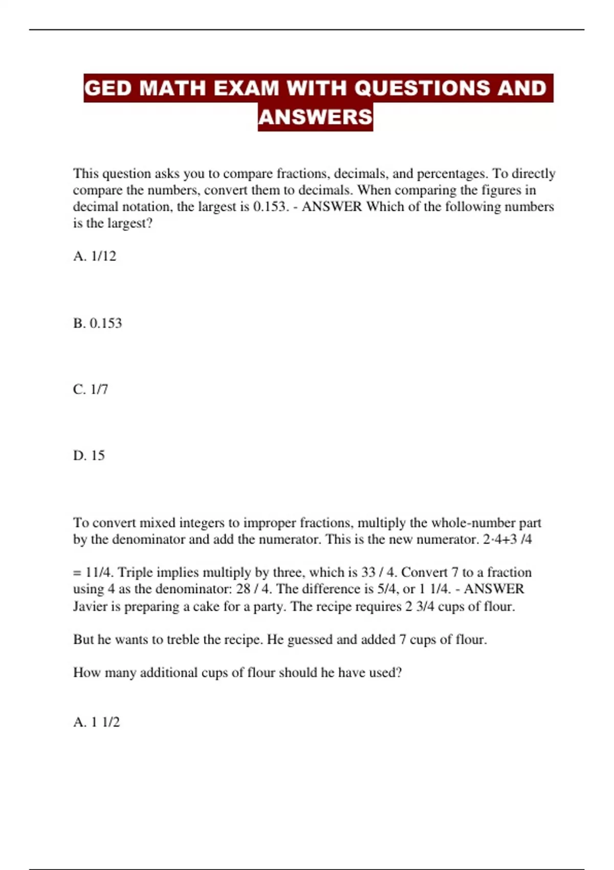ged math exam with questions and answers