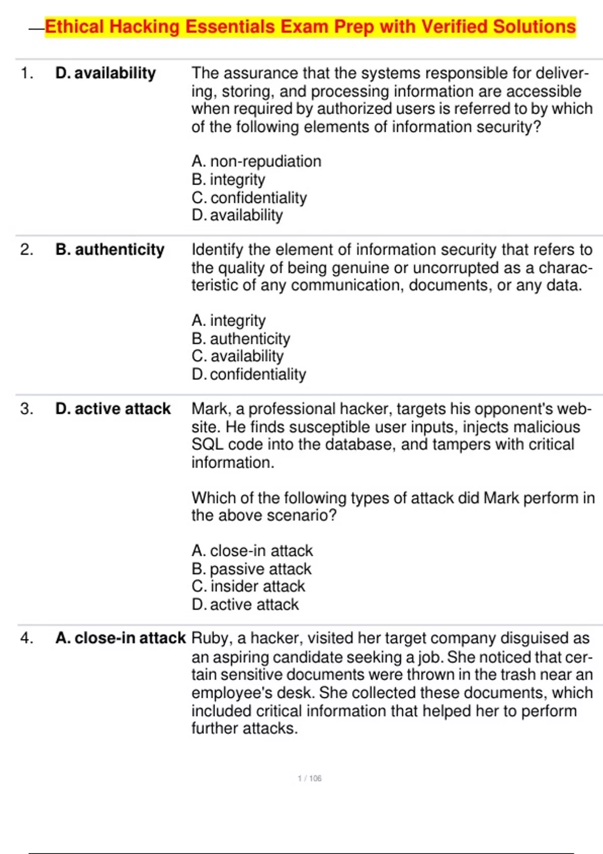 Ethical Hacking Essentials Exam Prep with Verified Solutions 1. D. availability 2. B. authenticity 3. D. active attack The assurance that the systems responsible for deliver- ing, storing, and processing information are accessible when required by authorized users is referred to by which of the following elements of information security? A. non-repudiation B. integrity C. confidentiality D. availability Identify the element of information security that refers to the quality of being genuine or uncorrupted as a charac- teristic of any communication, doc