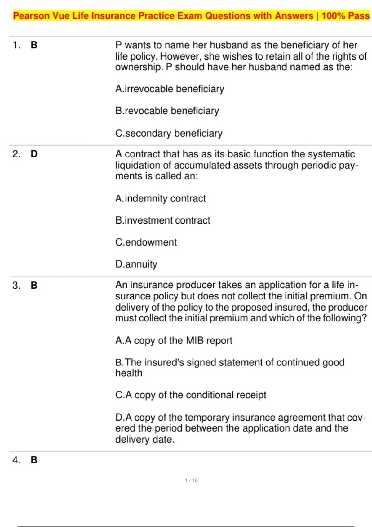 Pearson Vue Life Insurance Practice Exam Questions with Answers | 100% Pass 1. B 2. D 3. B P wants to name her husband as the beneficiary of her life policy. However, she wishes to retain all of the rights of ownership. P should have her husband named as the: A.irrevocable beneficiary B.revocable beneficiary C.secondary beneficiary A contract that has as its basic function the systematic liquidation of accumulated assets through periodic pay- ments is called an: A. indemnity contract B.investment contract C.endowment D.annuity An insurance producer takes an application for a life in- surance policy but does not collect the initial premium. On delivery of the policy to the proposed insured, the producer must collect the initial prem
