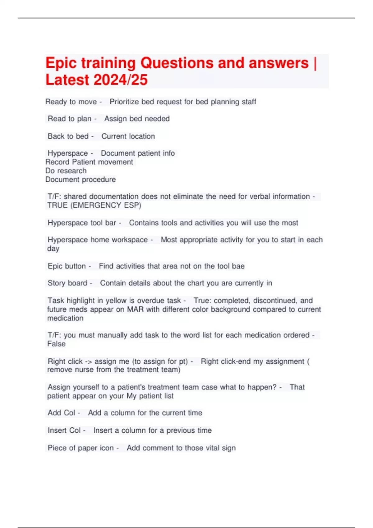 Epic training Questions and answers | Latest 2024/25 Ready hhto hhmove hh- hh hh hhPrioritize hhbed hhrequest hhfor hhbed hhplanning hhstaff hhRead hhto hhplan hh- hh hh hhAssign hhbed hhneeded hhBack hhto hhbed hh- hh hh hhCurrent hhlocation hhHyperspace hh- hh hh hhDocument hhpatient hhinfo hh Record hhPatient hhmovement hh Do hhresearch Document hhprocedure hhT/F: hhshared hhdocumentation hhdoes hhnot hheliminate hhthe hhneed hhfor hhverbal hhinformation hh- hh hh hhTRUE hh(EMERGENCY hhESP) hhHyperspace hhtool hhbar hh- hh hh hhContains hhtools hhand hhactivities hhyou hhwill hhuse hhthe hhmost hhHyperspace hhhome hhworkspace hh- hh hh hhMost hhappropriate hhactivity hhfor hhyou hhto hhstart hhin hheach hhday hhEpic hhbutton hh- hh hh hhFind hhactivities hhthat hharea hhnot hhon hhthe hhtool hhbae hhStory hhboard hh- hh hh hhContain hhdetails hhabout hhthe hhchart hhyou hhare hhcurrently hhin hhTask hhhighlight hhin hhyellow hhis hhoverdue hhtask hh- hh hh hhTrue: hhcompleted, hhdiscontinued, hhand hhfuture hhmeds hhappear hhon hhMAR hhwith hhdifferent hhcolor hhbackground hhcompared hhto hhcurrent hhmedication hhT/F: hhyou hhmust hhmanually hhadd hhtask hhto hhthe hhword hhlist hhfor hheach hhmedication hhordered hh- hh hh hhFalse hhRight hhclick hh-> hhassign hhme hh(to hhassign hhfor hhpt) hh- hh hh hhRight hhclick-end hhmy hhassignment hh( hhremove hhnurse hhfrom hhthe hhtreatment hhteam) hhAssign hhyourself hhto hha hhpatient's hhtreatment hhteam hhcase hhwhat hhto hhhappen? hh- hh hh hhThat hhpatient hhappear hhon hhyour hhMy hhpatient hhlist hhAdd hhCol hh- hh hh hhAdd hha hhcolumn hhfor hhthe hhcurrent hhtime hhInsert hhCol hh- hh hh hhInsert hha hhcolumn hhfor hha hhprevious hhtime hhPiece hhof hhpaper hhicon hh- hh hh hhAdd hhcomment hhto hhthose hhvital hhsign hhBefore hhfile, hhthere hhis hhstill hha hhblue hhline hhin hhfront hhof hhit hhwhich hhmeans hhdata hhis hhpending(still hhable hhto hhedit)->click hhfile hh- hh hh hhData hhwill hhautomatically hhfile hhif hhyou hhnavigate hhto hhanother hhtemplate hhor hhleave hhthe hhflowsheets hhactivity hhT/F: hha hhnurse hhcan hhsee hhflowsheet hhdocumentation hhthat hhwas hhcompleted hhby hhother hhclinical hhusers. hhAssume hhthat hhthere hhare hhno hhrestriction hhset hhup hhat hhyour hhorganization hh- hh hh hhTrue hhCompleted hhmed hhin hhthe hhMAR hh- hh hh hhSalmon hhcolor hhContinue hhmed hh- hh hh hhYellow hhActive hhmed hh- hh hh hhBlue hhClick hhon hhthe hhmedication hhrow hhto hh- hh hh hhMore hhdetail hhin hhroute, hhdose, hhetc hhof hhmed hhEdit hhadministration hhmed hhby hh- hh hh hhThe hhtime hhgiven hhthe hhmed=n -_____ hhOn hhthe hhMAR, hhhow hhcan hhyou hhdetermine hhthe hhnext hha hhdistraction hhtime hhof hhan hhorder? hh- hh hh hhCheck hhthe hhmedication's hhrow hh Scroll hhto hhthe hhnext hhdue hhtime hhAfter hha hhmedication hhhas hhbeen hhadministered, hhit hhcan hhnot hhbe hhedited hh- hh hh hhFalse hhT/F: hhMark hhall hhas hhNot hhNew hhis hha hhpersonal hhbookmark hhand hhdoes hhnot hhaffect hhwhat hhappears hhfor hhother hhproviders hh- hh hh hhTrue hhSmart hhtool hhcan hh________ hhdocumentation hh- hh hh hhSpeed hhup hhT/F: hhyou hhcan hhfilter hhnotes hhby hhtype hhusing hhtabs hhin hhthe hhnotes hhactivity hh- hh hh hhTrue hhT/F: hhyou hhcan hhonly hhwrite hhnotes hhusing hhEpic's hhsmart hhtool hh- hh hh hhFalse hhWhat hhdoes hhepic hhdefine hhacknowledge hhan hhorder hh- hh hh hhI hhhave hhseen hhthis hhorder hhHow hhto hhopen hhpt's hhorder? hh- hh hh hhDouble hhclick hhthe hhrow hhSigned hhand hhheld hhorder hh- hh hh hhOrders hhthat hharea hhauthorized, hhbut hhnot hhyet hhactive hh Order hhfor hhpt hhwho hhis hhbeing hhadmitted hhfrom hhthe hhED, hhtransferred, hhor hhgoing hhinto hhsurgery hhare hhcommonly hhsigned hhand hhheld hh Signed hhand hhheld hhremain hhheld hhuntil hha hhclinician( hhusually hha hhnurse hhreceiving hhthe hhpatient) hhreleases hhthe hhorders hhHome hhmed hh- hh hh hhReview hhhome hhmedication hhManage hhlab hh- hh hh hhReview, hhcollect, hhand hhdiscontinue hhlab hhorders. hhReview hhand hhupdate hhthe hhpt's hhcollection hhstatus hhOrder hhhistory hh- hh hh hhShows hhall hhorder hhfrom hhthe hhadmission, hhnot hhjust hhactive hhones. hhYou hhcan hhreorder hhhere.
