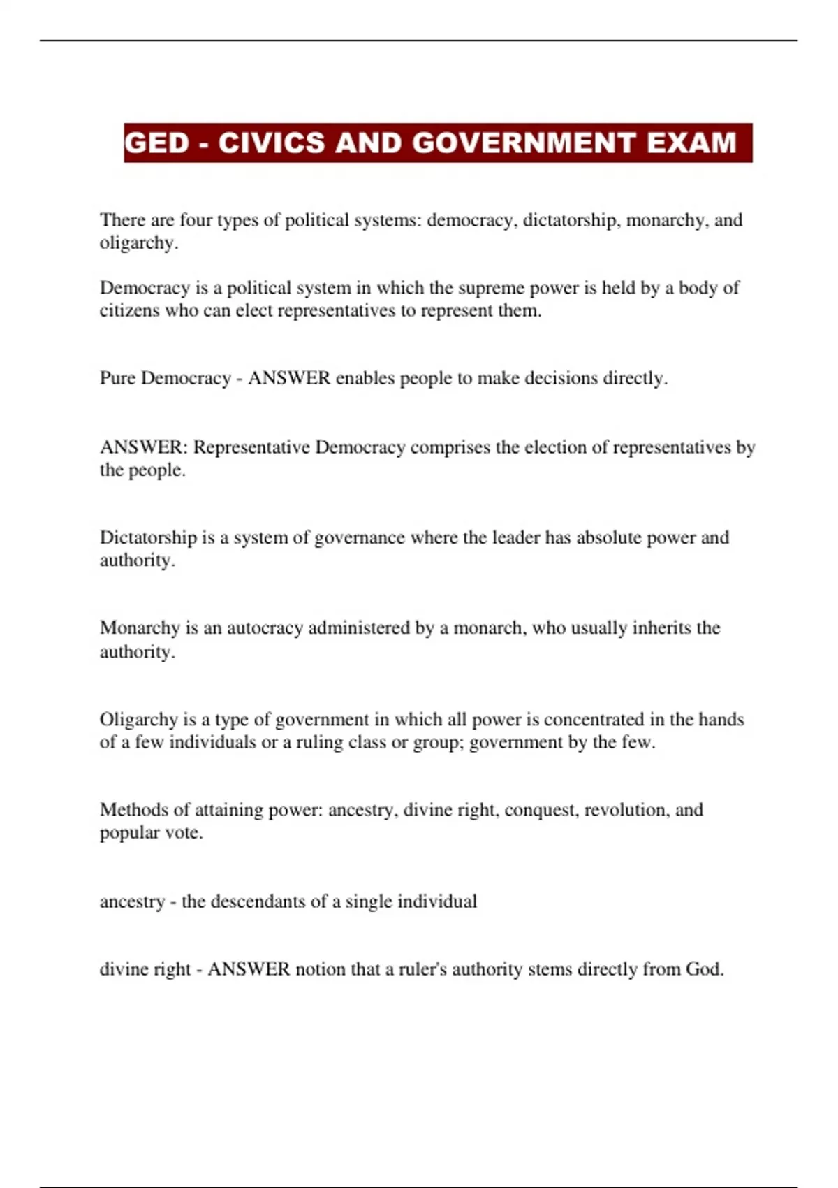 GED - CIVICS AND GOVERNMENT EXAM There are four types of political systems: democracy, dictatorship, monarchy, and oligarchy. Democracy is a political system in which the supreme power is held by a body of citizens who can elect representatives to represent them. Pure Democracy - ANSWER enables people to make decisions directly. ANSWER: Representative Democracy comprises the election of representatives by the people. Dictatorship is a system of governance where the leader has absolute power and authority. Monarchy is an autocracy administered by a monarch, who usually inherits the authority. Oligarchy is a type of government in which all power is concentrated in the han ds of a few individuals or a ruling class or group; government by the few. Methods of attaining power: ancestry, divine right, conquest, revolut ion, and popular vote. ancestry - the descendants of a single individual divine right - ANSWER notion that a ruler's authority stems directly from God. Conquest - ANSWER capturing or taking something by force. Revolution is the overthrow of a government by those who are governed. popular vote - ANSWER vote of people in a "general election" Federalism is a system in which power is split between national and st ate governments. The three branches of the United States government are legislative, executiv e, and judicial. legislative - the branch of government that creates laws. The executive branch of government is responsible for enforcing and carrying ou t laws. The judicial branch of government interprets legislation and assesses wh ether they are constitutional. US Congress - ANSWER The name for the United States' bicameral legislature, which consists of the House of Representatives and the Senate. The name for th e legislative branch of the United States government.