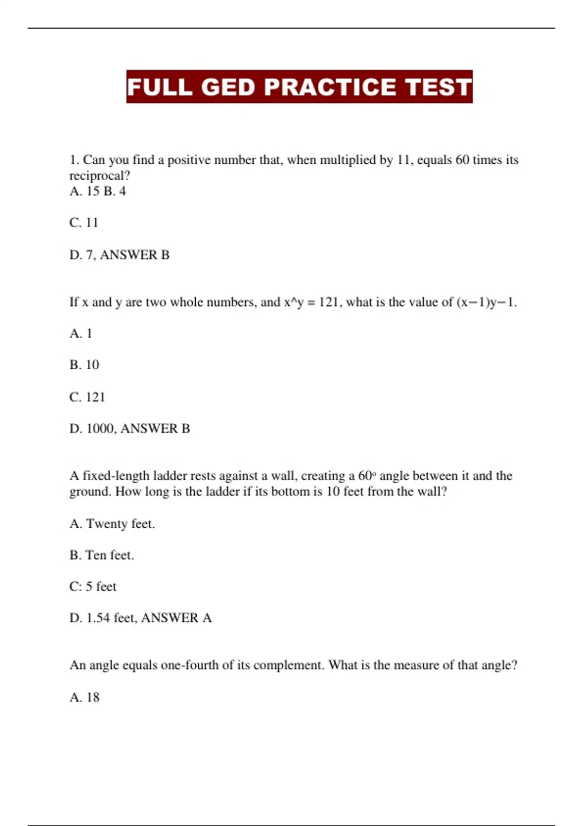 FULL GED PRACTICE TEST 1. Can you find a positive number that, when multiplied by 11, equals 60 t imes its reciprocal? A. 15 B. 4 C. 11 D. 7, ANSWER B If x and y are two whole numbers, and x^y = 121, what is the value of (x −1)y−1. A. 1 B. 10 C. 121 D. 1000, ANSWER B A fixed-length ladder rests against a wall, creating a 60 ᵒ angle between it and the ground. How long is the ladder if its bottom is 10 feet from the wall? A. Twenty feet. B. Ten feet. C: 5 feet D. 1.54 feet, ANSWER A An angle equals one-fourth of its complement. What is the measure of that angle ? A. 18 B. 36 C. 45 D. 72, ANSWER B The complement of an angle exceeds it by 60 ᵒ. Then what would the angle be? A. 30 B. 15 C. 35 D. 90, ANSWER 15. If a right triangle's two acute angles differ by 10 ᵒ, what is the lesser angle's measurement? A. 50 B. 40 C. 80 D. 70, ANSWER B A circle is engraved in a 4-square area. What will be the circle's area? A. 2 π B. π C. 16 π D. π/2 - Answer B. The circumference of a circle is xπ units, whereas the area is yπ units. If x equals y, what is the circle's radius? A. 1 B. 3 C. π D. 2: ANSWER D If A is the area and C is the circumference of a circle, which of the following depicts the relationship between A and C? A. 2C B. 2C2 √π C. C2/4π D. 4πC - Answer: C If a school has 1050 pupils with a 9:5 male- to-female ratio, how many boys are there? A. 800 B. 675 C. 650 D. 445 – ANSWER C The price of a scooter is three times that of television. If a scooter costs $600 more than a television, how much does the television cost? A. 1800$