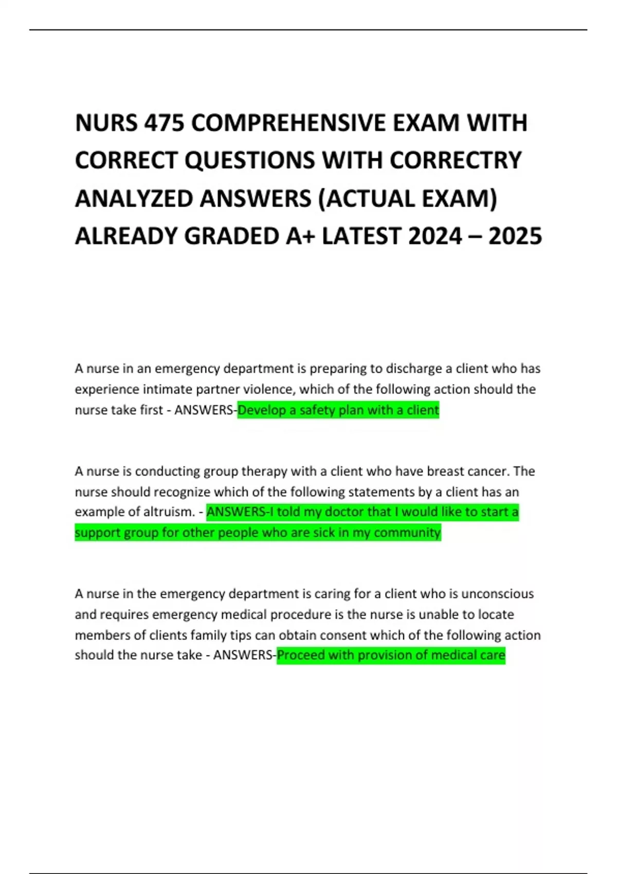 NURS 475 COMPREHENSIVE EXAM WITH CORRECT QUESTIONS WITH CORRECTRY ANALYZED ANSWERS (ACTUAL EXAM) ALREADY GRADED A+ LATEST 2024 – 2025