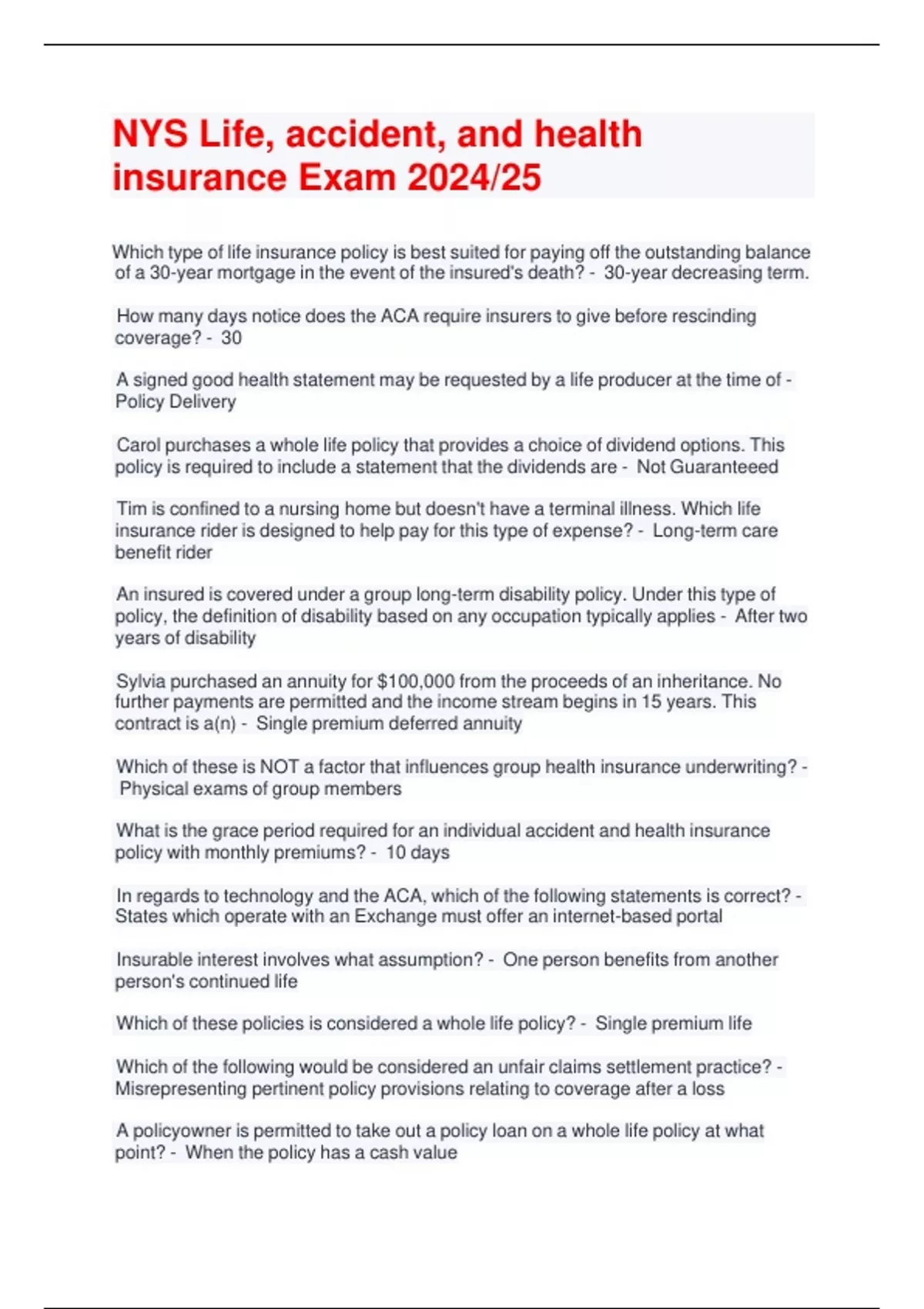 NYS Life, accident, and health insurance Exam 2024/25 Which jjjtype jjjof jjjlife jjjinsurance jjjpolicy jjjis jjjbest jjjsuited jjjfor jjjpaying jjjoff jjjthe jjjoutstanding jjjbalance jjjof jjja jjj30-year jjjmortgage jjjin jjjthe jjjevent jjjof jjjthe jjjinsured's jjjdeath? jjj- jjj jjj30-year jjjdecreasing jjjterm. jjjHow jjjmany jjjdays jjjnotice jjjdoes jjjthe jjjACA jjjrequire jjjinsurers jjjto jjjgive jjjbefore jjjrescinding jjjcoverage? jjj- jjj jjj30 jjjA jjjsigned jjjgood jjjhealth jjjstatement jjjmay jjjbe jjjrequested jjjby jjja jjjlife jjjproducer jjjat jjjthe jjjtime jjjof jjj- jjj jjjPolicy jjjDelivery jjjCarol jjjpurchases jjja jjjwhole jjjlife jjjpolicy jjjthat jjjprovides jjja jjjchoice jjjof jjjdividend jjjoptions. jjjThis jjjpolicy jjjis jjjrequired jjjto jjjinclude jjja jjjstatement jjjthat jjjthe jjjdividends jjjare jjj- jjj jjjNot jjjGuaranteeed jjjTim jjjis jjjconfined jjjto jjja jjjnursing jjjhome jjjbut jjjdoesn't jjjhave jjja jjjterminal jjjillness. jjjWhich jjjlife jjjinsurance jjjrider jjjis jjjdesigned jjjto jjjhelp jjjpay jjjfor jjjthis jjjtype jjjof jjjexpense? jjj- jjj jjjLong -term jjjcare jjjbenefit jjjrider jjjAn jjjinsured jjjis jjjcovered jjjunder jjja jjjgroup jjjlong-term jjjdisability jjjpolicy. jjjUnder jjjthis jjjtype jjjof jjjpolicy, jjjthe jjjdefinition jjjof jjjdisability jjjbased jjjon jjjany jjjoccupation jjjtypically jjjapplies jjj- jjj jjjAfter jjjtwo jjjyears jjjof jjjdisability jjjSylvia jjjpurchased jjjan jjjannuity jjjfor jjj$100,000 jjjfrom jjjthe jjjproceeds jjjof jjjan jjjinheritance. jjjNo jjjfurther jjjpayments jjjare jjjpermitted jjjand jjjthe jjjincome jjjstream jjjbegins jjjin jjj15 jjjyears. jjjThis jjjcontract jjjis jjja(n) jjj- jjj jjjSingle jjjpremium jjjdeferred jjjannuity jjjWhich jjjof jjjthese jjjis jjjNOT jjja jjjfactor jjjthat jjjinfluences jjjgroup jjjhealth jjjinsurance jjjunderwriting? jjj- jjj jjjPhysical jjjexams jjjof jjjgroup jjjmembers jjjWhat jjjis jjjthe jjjgrace jjjperiod jjjrequired jjjfor jjjan jjjindividual jjjaccident jjjand jjjhealth jjjinsurance jjjpolicy jjjwith jjjmonthly jjjpremiums? jjj- jjj jjj10 jjjdays jjjIn jjjregards jjjto jjjtechnology jjjand jjjthe jjjACA, jjjwhich jjjof jjjthe jjjfollowing jjjstatements jjjis jjjcorrect? jjj- jjj jjjStates jjjwhich jjjoperate jjjwith jjjan jjjExchange jjjmust jjjoffer jjjan jjjinternet -based jjjportal jjjInsurable jjjinterest jjjinvolves jjjwhat jjjassumption? jjj- jjj jjjOne jjjperson jjjbenefits jjjfrom jjjanother jjjperson's jjjcontinued jjjlife jjjWhich jjjof jjjthese jjjpolicies jjjis jjjconsidered jjja jjjwhole jjjlife jjjpolicy? jjj- jjj jjjSingle jjjpremium jjjlife jjjWhich jjjof jjjthe jjjfollowing jjjwould jjjbe jjjconsidered jjjan jjjunfair jjjclaims jjjsettlement jjjpractice? jjj- jjj jjjMisrepresenting jjjpertinent jjjpolicy jjjprovisions jjjrelating jjjto jjjcoverage jjjafter jjja jjjloss jjjA jjjpolicyowner jjjis jjjpermitted jjjto jjjtake jjjout jjja jjjpolicy jjjloan jjjon jjja jjjwhole jjjlife jjjpolicy jjjat jjjwhat jjjpoint? jjj- jjj jjjWhen jjjthe jjjpolicy jjjhas jjja jjjcash jjjvalue jjjWhich jjjof jjjthese jjjis jjjNOT jjja jjjfactor jjjduring jjjthe jjjhealth jjjinsurance jjjunderwriting jjjprocess? jjj- jjj jjjFormer jjjresidence jjjNew jjjYork jjjworkers jjjcompensation jjjlaws jjjexclude jjjbenefits jjjfor jjjdisabilities jjjcaused jjjby jjj- jjj jjjIntentional, jjjself-inflicted jjjinjuries jjjoccurring jjjon jjjthe jjjjob jjjWhen jjjpremiums jjjare jjjdetermined, jjjone jjjfactor jjjwould jjjbe jjjthe jjjexpenses jjjof jjjthe jjj- jjj jjjInsurer jjjScott jjjhas jjja jjjlife jjjinsurance jjjpolicy jjjin jjjwhich jjjthe jjjdividends jjjare jjjleft jjjwith jjjthe jjjinsurance jjjcompany. jjjThis jjjparticular jjjpolicy jjjmay jjjbe jjjpaid jjjup jjjwhen jjjthe jjjcash jjjvalue jjjplus jjjaccumulated jjjdividends jjj- jjj jjjequal jjjthe jjjnet jjjsingle jjjpremium jjjfor jjjthe jjjsame jjjface jjjamount jjjat jjjthe jjjinsured's jjjattained jjjage jjjDuring jjjopen jjjenrollment jjjfor jjjMedicare jjjSupplement jjjcoverage, jjjan jjjapplicant jjjMUST jjjbe jjjat jjjleast jjj- jjj jjjThere jjjis jjjno jjjminimum jjjage jjjrequirement jjjWhat jjjhappens jjjto jjjthe jjjcash jjjvalue jjjof jjja jjjmarket jjjvalue jjjadjusted jjjannuity jjjif jjjit's jjjsurrendered jjjprior jjjto jjjthe jjjend jjjof jjjthe jjjstated jjjguarantee jjjperiod? jjj- jjj jjjSubject jjjto jjjmarket jjjvalue jjjadjustment jjjWhich jjjof jjjthe jjjfollowing jjjcontracts jjjoffer jjjdeferred jjjtaxation, jjjflexible jjjpayments, jjja jjjguaranteed jjjinterest jjjrate, jjjand jjjdeath jjjbenefits jjjequal jjjto jjjthe jjjcash jjjvalue? jjj- jjj jjjFlexible jjjpremium jjjfixed jjjannuity jjjTonya jjjhas jjjbeen jjjdiagnosed jjjwith jjjkidney jjjfailure jjjand jjjhas jjjgroup jjjaccident jjjand jjjhealth jjjinsurance jjjthrough jjjher jjjlarge jjjemployer. jjjWhich jjjof jjjthese jjjaccident jjjand jjjhealth jjjplans jjjwill jjjbe jjjprimary jjjduring jjjthe jjjmonths jjjfollowing jjjher jjjdiagnosis? jjj- jjj jjjHer jjjemployer's jjjgroup jjjaccident jjjand jjjhealth jjjplan jjjWhich jjjstatement jjjregarding jjjthe jjjcertificate jjjof jjjinsurance jjjis jjjaccurate? jjj- jjj jjjIt jjjindicates jjjevidence jjjof jjjan jjjemployee's jjjinsurance jjjcoverage jjjAccording jjjto jjjthe jjjACA, jjjthe jjjproportion jjjof jjjpremium jjjrevenues jjjspent jjjon jjjclinical jjjservices jjjand jjjquality jjjimprovements jjjis jjjcalled jjjthe jjj- jjj jjjMedical jjjloss jjjratio jjjWhich jjjof jjjthe jjjfollowing jjjstatements jjjregarding jjjthe jjjFair jjjCredit jjjReporting jjjAct jjjis jjjcorrect? jjj- jjj jjjIf jjjcredit, jjjinsurance, jjjor jjjemployment jjjwas jjjdenied jjjbecause jjjof jjjan jjjunfavorable jjjreport, jjjthe jjjconsumer jjjmust jjjbe jjjadvised jjjAccording jjjto jjjthe jjjACA, jjjinsurers jjjcan jjjno jjjlonger jjjdeny jjjhealth jjjcoverage jjjdue jjjto jjjpre-