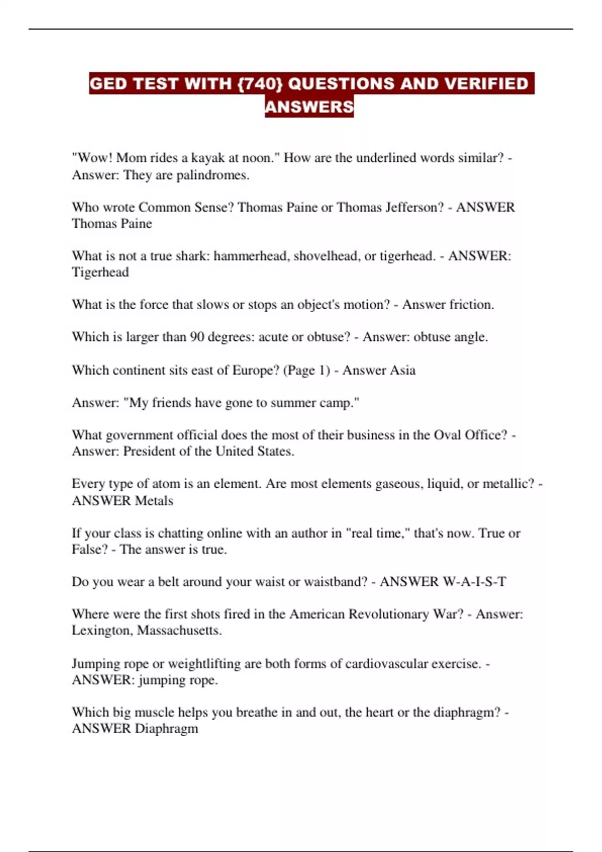 GED TEST WITH {740} QUESTIONS AND VERIFIED ANSWERS "Wow! Mom rides a kayak at noon." How are the underlined words similar? - Answer: They are palindromes. Who wrote Common Sense? Thomas Paine or Thomas Jefferson? - ANSWER Thomas Paine What is not a true shark: hammerhead, shovelhead, or tigerhead. - ANSWER: Tigerhead What is the force that slows or stops an object's motion? - Answer friction. Which is larger than 90 degrees: acute or obtuse? - Answer: obtuse a ngle. Which continent sits east of Europe? (Page 1) - Answer Asia Answer: "My friends have gone to summer camp." What government official does the most of their business in the Oval Off ice? - Answer: President of the United States. Every type of atom is an element. Are most elements gaseous, liquid, or metallic? - ANSWER Metals If your class is chatting online with an author in "real time," that's now. T rue or False? - The answer is true. Do you wear a belt around your waist or waistband? - ANSWER W-A-I-S- T Where were the first shots fired in the American Revolutionary War? - Answer: Lexington, Massachusetts. Jumping rope or weightlifting are both forms of cardiovascular exercise. - ANSWER: jumping rope. Which big muscle helps you breathe in and out, the heart or the diaphragm? - ANSWER Diaphragm A number divided by another is referred to as the divisor. True or False? - ANSWER: false. Classify from lowest to highest: Sierra Nevada, Rockies, and Appalachians. "The angry sky dumped water on us!" - is this a personification or metaphor? ANSWER personification What city was George Washington sworn in as the first US president? - Ans wer: New York City. Is a simple machine made up of a wheel and a rope termed a lever, gear, or pulley? - ANSWER pulley Which is the tallest mountain in the United States? - ANSWER Mount McK inley Which of the following employs a connecting verb? The answer is: "Joe feels awful." B: "Joe feels the dog's fur." Answer A: "Joe feels awful." What inventor used a steam engine to provide more power to boats? - ANSWER Robert Fulton If your tea is decaffeinated, it still contains caffeine. True or False? - The answer i s untrue. Do most of your muscles function independently or in pairs? - Answ er pairings Find the product of 80*7. ANSWER 560 On a map, the numbered and lettered squares make up a pattern called... what? ANSWER grid Answer with a homonym pair: What is it called when the cost of a bus ride is affordable? - The answer is fair fore. When the Spanish conquered the Aztecs, who was their chief? - Answer Montezuma In chemistry, what does the symbol "C" represent? - ANSWER Carbon Which sport has existed the longest: roller skating, ice skating, or sk ateboarding? - ANSWER: Ice skating. "Jed was sick. Now he's better." Connect these sentences with a conjunction: ANSWER "Jed was sick, but now he's better." Are the first words of the Constitution known as the Introduction or the Preamble ? - Answer Preamble Do you meditate by sitting quietly and clearing your mind, or do you try to f loat in the air? - ANSWER: You sit quietly to cleanse your mind. What forms over the ocean: a hurricane or a tornado? - ANSWER: A hurricane Our bus left at 12:45 p.m. The trip took 4 and a half hours. What time did we arrive? - ANSWER: 5:15 pm The largest mountain system in Europe is the Alps. Is a flashback a plot interlude that provides background information or a brainstorm? - ANSWER It's a tale interruption that provides knowledge fr om the past. Who commanded the Spanish army that vanquished the Aztecs? - ANSWER Hernando Cortes Which is the best electrical conductor: wood, ceramics, or copper? - An swer: copper Is "confetti" made of coloured paper or extremely thin noodles? - ANSWER: fragments of coloured paper Spell the noun that derives from the adjective "silly." - Answer: sill iness In what war were the American forces known as the Continental Army? - ANSWER The American Revolution or War of Independence. The bald eagle does not have any feathers on its head. True or False? - The answ er is untrue. Are there equal or unequal hours of daylight and darkness during an equinox? - The answer is equal. Using a pencil and paper, determine the sun of $23.47 and $69.03 - th e answer is $92.50.