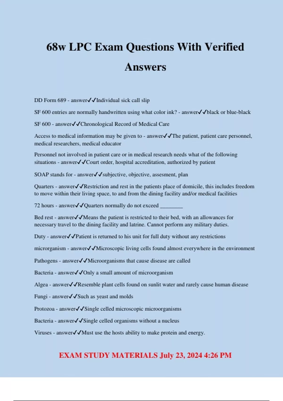 68w LPC Exam Questions With Verified Answers DD Form 689 - answerIndividual sick call slip SF 600 entries are normally handwritten using what color ink? - answerblack or blue-black SF 600 - answerChronological Record of Medical Care Access to medical information may be given to - answerThe patient, patient care personnel, medical researchers, medical educator Personnel not involved in patient care or in medical research needs what of the following situations - answerCourt order, hospital accreditation, authorized by patient SOAP stands for - answersubjective, objective, assesment, plan Quarters - answerRestriction and rest in the patients place of domicile, this includes freedom to move within their living space, to and from the dining facility and/or medical facilities 72 hours - answerQuarters normally do not exceed ________ Bed rest - answerMeans the patient is restricted to their bed, with an allowances for necessary travel to the dining facility and latrine. Cannot perform any military duties. Duty - answerPatient is returned to his unit for full duty without any restrictions microrganism - answerMicroscopic living cells found almost everywhere in the environment Pathogens - answerMicroorganisms that cause disease are called Bacteria - answerOnly a small amount of microorganism Algea - answerResemble plant cells found on sunlit water and rarely cause human disease Fungi - answerSuch as yeast and molds Protozoa - answerSingle celled microscopic microorganisms Bacteria - answerSingle celled organisms without a nucleus Viruses - answerMust use the hosts abil