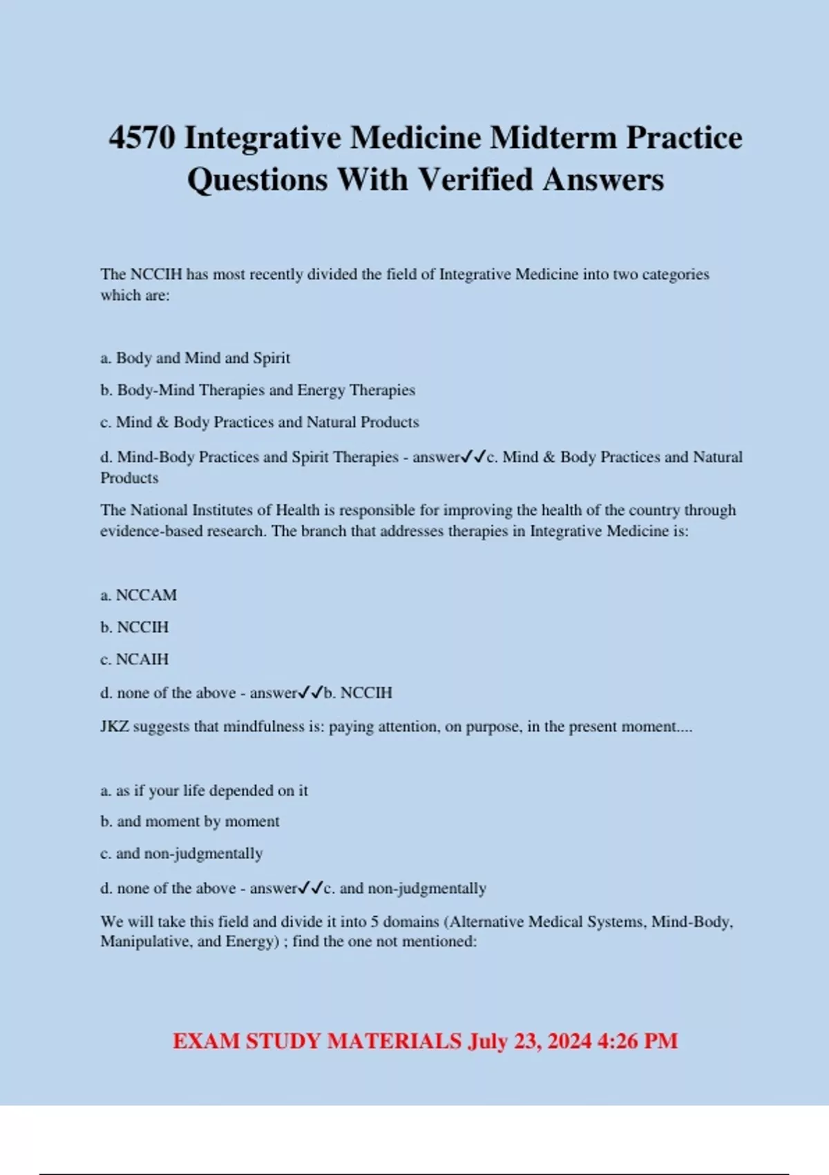 4570 Integrative Medicine Midterm Practice Questions With Verified Answers The NCCIH has most recently divided the field of Integrative Medicine into two categories which are: a. Body and Mind and Spirit b. Body-Mind Therapies and Energy Therapies c. Mind & Body Practices and Natural Products d. Mind-Body Practices and Spirit Therapies - answerc. Mind & Body Practices and Natural Products The National Institutes of Health is responsible for improving the health of the country through evidence-based research. The branch that addresses therapies in Integrative Medicine is: a. NCCAM b. NCCIH c. NCAIH d. none of the above - answerb. NCCIH JKZ suggests that mindfulness is: paying attention, on purpose, in the present moment.... a. as if your life depended on it b. and moment by moment c. and non-judgmentally d. none of the above - answerc. and non-judgmentally We will take this field and divide it into 5 domains (Alternative Medical Systems, Mind-Body, Manipulative, and Energy) ; find the one not mentioned: EXAM STUDY MATERIALS July 23, 2024 4:26 PM a. Reiki b. Biologically-based c. Mind therapies d. QiGong - answerb. Biologically-based Western Medicine is known by many names, identify the correct list: a. Common, Allopathic, Eastern b. Ayurveda, Conventional, and Homeopathic c. Allopathic, Traditional, Conventional d. Naturopathy, Allopathic, Common - answerc. Allopathic, Traditional, Conventional The man who was the first medical student studying in China and the year he completed the first survey of the US for use of complementary therapies: a. David Eisenberg and 2000 b. Andrew Weil and 1990 c. David Eisenberg and 1993 d. Herbert Benson and 1993 - answerc. David Eisenberg and 1993 The man who established the training for physicians in Integrative Medicine at the University of Arizona. a. Bernie Siegel b. Herbert Benson c. Andrew Weil d. Deepak Chopra - answerc. Andrew Wei The National Health Interview Survey (NHIS) is completed yearly in the US. Every 5 years, questions about the use of IM therapies are also asked. We know the percent of the population using at least one of these therapies has been tracked across specific years--which years? And what is the general range of percent of us