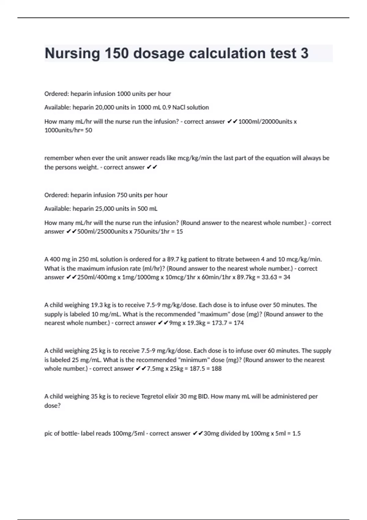 Nursing 150 dosage calculation test 3 questions well answered to pass