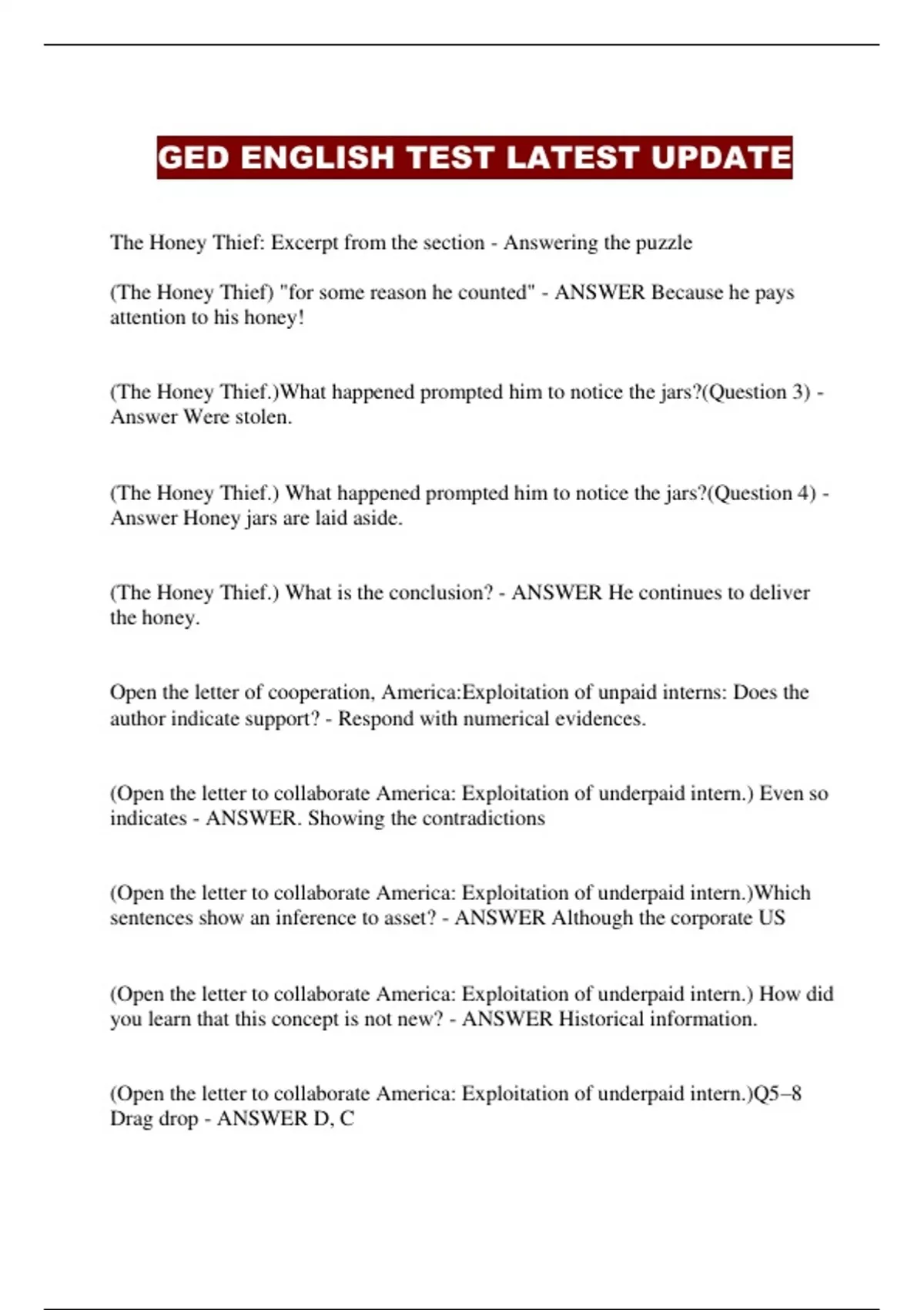 GED ENGLISH TEST LATEST UPDATE The Honey Thief: Excerpt from the section - Answering the puzzle (The Honey Thief) "for some reason he counted" - ANSWER Because he pays attention to his honey! (The Honey Thief.)What happened prompted him to notice the jars?(Question 3) - Answer Were stolen. (The Honey Thief.) What happened prompted him to notice the jars?(Question 4) - Answer Honey jars are laid aside. (The Honey Thief.) What is the conclusion? - ANSWER He continues to deliver the honey. Open the letter of cooperation, America:Exploitation of unpaid interns: D oes the author indicate support? - Respond with numerical evidences. (Open the letter to collaborate America: Exploitation of underpaid int ern.) Even so indicates - ANSWER. Showing the contradictions (Open the letter to collaborate America: Exploitation of underpaid inter n.)Which sentences show an inference to asset? - ANSWER Although the corporate US (Open the letter to collaborate America: Exploitation of underpaid inter n.) How did you learn that this concept is not new? - ANSWER Historical informatio n. (Open the letter to collaborate America: Exploitation of underpaid inter n.)Q5 –8 Drag drop - ANS WER D, C B,A DON QUIXOTE: What is the outcome of _____________? - ANSWER Successful on the battlefield. (DON QUIXOTE) What is Don's character? - ANSWER of confidence (DON QUIXOTE) What exactly does "pay worship" mean? - Answer: Sancho Panza (DON QUIXOTE) Extract sentences? - ANSWER From paragraph 9. (Don Quixote)What is Sacho's take on Don? - ANSWER Sacho worried about Don. Changing Mail Protocol: What Does 'deemed' Mean? - ANSWER Considering Solution (Changing the Mail Protocol) Which one refers to Paragraph 2? - ANSWER Mailroom is really cooperative. (Changing the Mail Protocol)Which one demonstrates a rigid protocol ? - ANSWER will return to sender. (Changing Mail Protocol) Q4-5. How is the author feeling? (Drag Drop) - T he answer is A.1.React with the reader. A2. Deemed