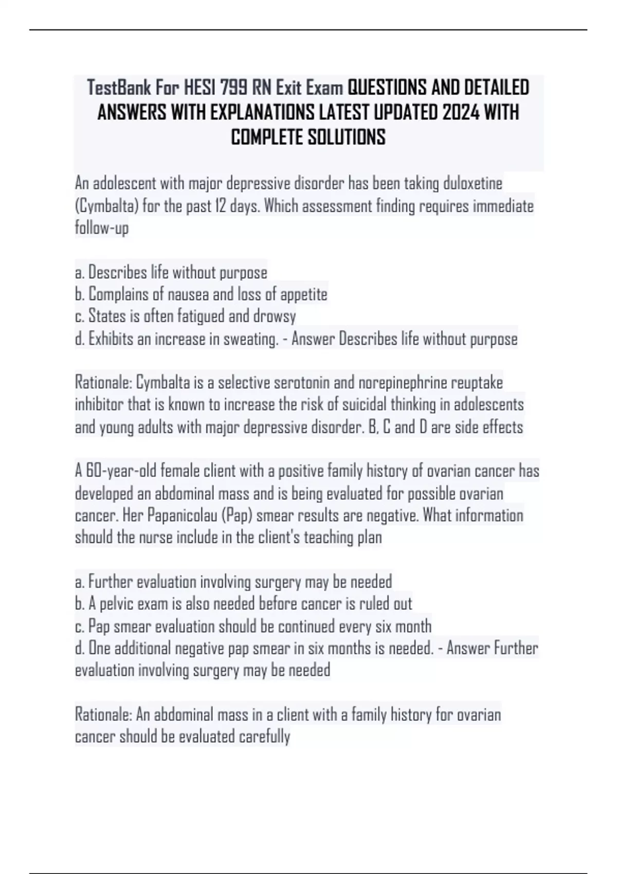 TestBank For HESI 799 RN Exit Exam QUESTIONS AND DETAILED ANSWERS WITH EXPLANATIONS LATEST UPDATED 2024 WITH COMPLETE SOLUTIONS An adolescent with major depressive disorder has been taking duloxetine (Cymbalta) for the past 12 days. Which assessment finding requires immediate follow -up a. Describes life without purpose b. Complains of nausea and loss of appetite c. States is often fatigued and drowsy d. Exhibits an increase in sweating. - Answer Describes life without purpose Rationale: Cymbalta is a selective serotonin and norepinephrine reuptake inhibitor that is known to increase the risk of suicidal thinking in adolescents and young adults with major depressive disorder. B, C and D are side effects A 60-year-old female cli ent with a positive family history of ovarian cancer has developed an abdominal mass and is being evaluated for possible ovarian cancer. Her Papanicolau (Pap) smear results are negative. What information should the nurse include in the client's teaching pl an a. Further evaluation involving surgery may be needed b. A pelvic exam is also needed before cancer is ruled out c. Pap smear evaluation should be continued every six month d. One additional negative pap smear in six months is needed. - Answer Further evaluation involving surgery may be needed Rationale: An abdominal mass in a client with a family history for ovarian cancer should be evaluated carefully A client who recently underwent a tracheostomy is being prepared for discharge to home. Which instr uctions is most important for the nurse to include in the discharge plan? a. Explain how to use communication tools. b. Teach tracheal suctioning techniques c. Encourage self -care and independence. d. Demonstrate how to clean tracheostomy site. - Answer T each tracheal suctioning techniques Rationale: Suctioning helps to clear secretions and maintain an open airway, which is critical. In assessing an adult client with a partial rebreather mask, the nurse notes that the oxygen reservoir bag does not deflat e completely during inspiration and the client's respiratory rate is 14 breaths / minute. What action should the nurse implement a. Encourage the client to take deep breaths b. Remove the mask to deflate the bag c. Increase the liter flow of oxygen d. Document the assessment data - Answer Document the assessment data Rational: reservoir bag should not deflate completely during inspiration and the client's respiratory rate is within normal limits. Following discharge teaching, a male client with duodenal ulcer tells the nurse the he will drink plenty of dairy products, such as milk, to help coat and protect his ulcer. What is the best follow -up action by the nurse? a. Remind the client that it is also important to switch to decaffeinated coffee and tea. b. Suggest that the client also plan to eat frequent small meals to reduce discomfort c. Review with the client the need to avoid foods that are rich in milk and cream. d. Reinforce this teaching by asking the client to list a dairy food that he might select. - Answer Review with the client the need to avoid foods that are rich in milk and cream Rationale: Diets rich in milk and cream stimulate gastric acid secretion and should be avoided. A male c lient with hypertension, who received new antihypertensive prescriptions at his last visit returns to the clinic two weeks later to evaluate his blood pressure (BP). His BP is 158/106 and he admits that he has not been taking the prescribed medication beca use the drugs make him "feel bad". In explaining the need for hypertension control, the nurse should stress that an elevated BP places the client at risk for which pathophysiological condition? a. Blindness secondary to cataracts b. Acute kidney injury du e to glomerular damage c. Stroke secondary to hemorrhage d. Heart block due to myocardial damage - Answer Stroke secondary to hemorrhage Rationale: Stroke related to cerebral hemorrhage is major risk for uncontrolled hypertension. The nurse observes an u nlicensed assistive personnel (UAP) positioning a newly admitted client who has a seizure disorder. The client is supine and the UAP is placing soft pillows along the side rails. What action should the nurse implement? a. Ensure that the UAP has placed t he pillows effectively to protect the client. b. Instruct the UAP to obtain soft blankets to secure to the side rails instead of pillows. c. Assume responsibility for placing the pillows while the UAP completes another task. d. Ask the UAP to use some of t he pillows to prop the client in a side lying position. - Answer Instruct the UAP to obtain soft blankets to secure to the side rails instead of pillows Rationale: The nurse should instruct the UAP to pad the side rails with soft blankest because the use of pillows could result in suffocation and would need to be removed at the onset of the seizure. The nurse can delegate paddling the side rails to the UAP During shift report, the central electrocardiogram (EKG) monitoring system alarms. Which client alarm should the nurse investigate first? a. Respiratory apnea of 30 seconds b. Oxygen saturation rate of 88% c. Eight premature ventricular beats every minute d. Disconnected monitor signal for the last 6 minu tes. - Answer Respiratory apnea of 30 seconds Rationale: The priority is the client whose alarm indicating respiratory apnea that should be assessed first. During a home visit, the nurse observed an elderly client with diabetes slip and fall. What action should the nurse take first? a. Give the client 4 ounces of orange juice