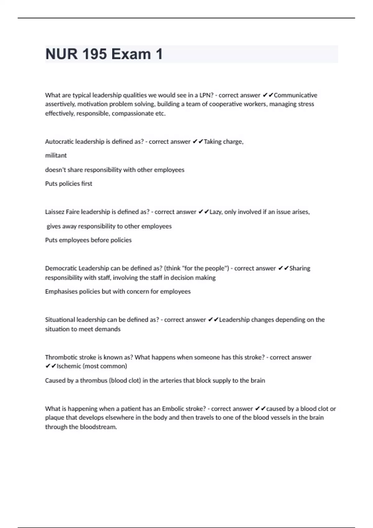 What is happening when a patient has an Embolic stroke? - correct answer ✔✔caused by a blood clot or plaque that develops elsewhere in the body and then travels to one of the blood vessels in the brain through the bloodstream. What is happening when a patient has a hemorrhagic stroke? - correct answer ✔✔A rupture of an artery