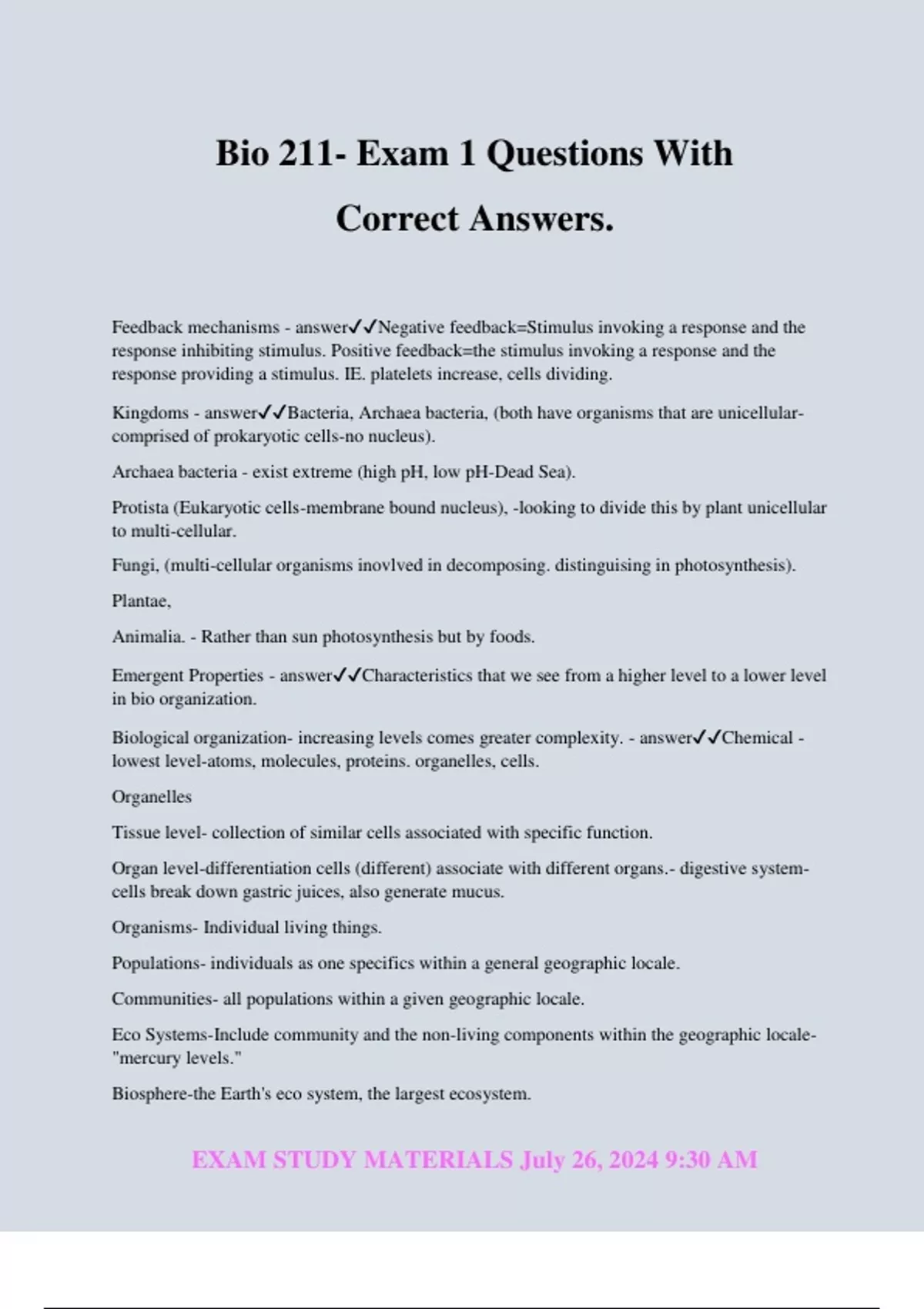 comprised of prokaryotic cells -no nucleus). Archaea bacteria - exist extreme (high pH, low pH -Dead Sea). Protista (Eukaryotic cells -membrane bound nucleus), -looking t o divide this by plant unicellular to multi -cellular. Fungi, (multi -cellular organisms inovlved in decomposing. distinguising in photosynthesis). Plantae, Animalia. - Rather than sun photosynthesis but by foods. Emergent Properties - answer✔✔Characteristi cs that we see from a higher level to a lower level in bio organization. Biological organization - increasing levels comes greater complexity. - answer✔✔Chemical - lowest level -atoms, molecules, proteins. organelles, cells. Organelles Tissue level - collect ion of similar cells associated with specific function. Organ level -differentiation cells (different) associate with different organs. - digestive system -