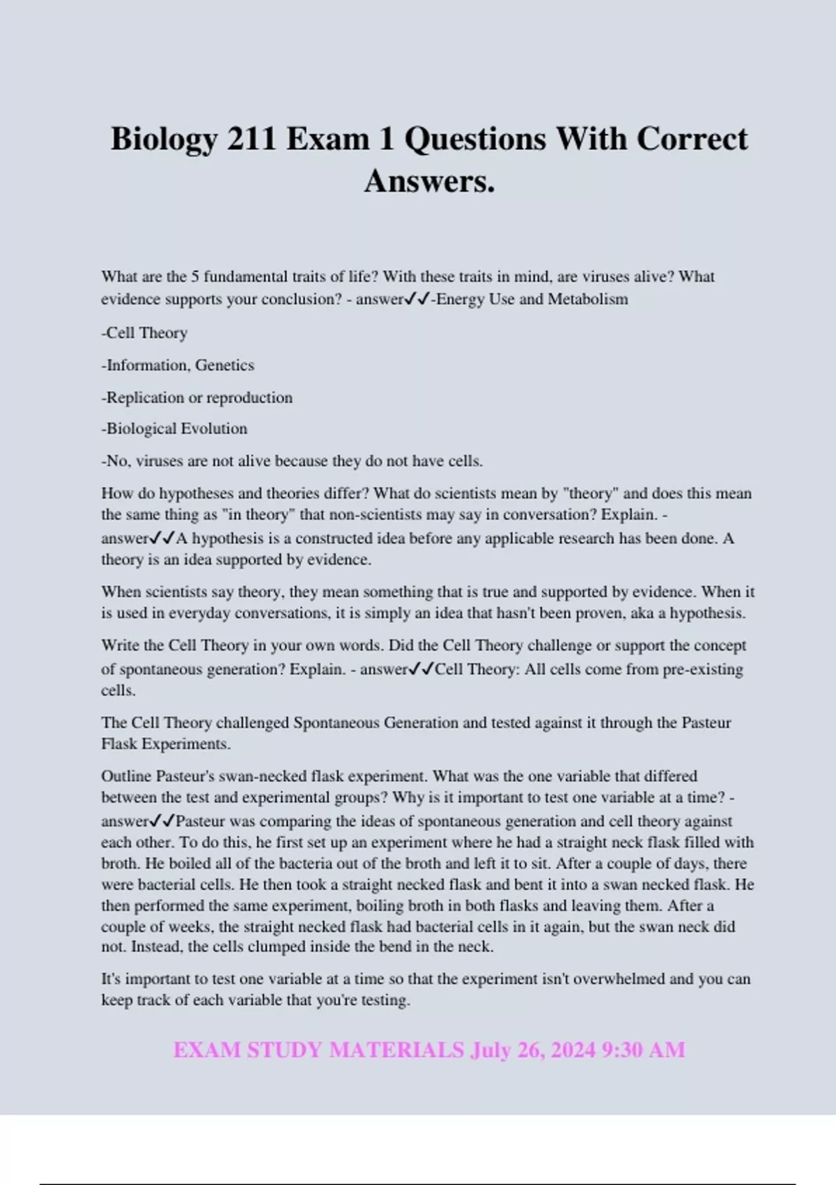 Biology 211 Exam 1 Questions With Correct Answers. What are the 5 fundamental traits of life? With these traits in mind, are viruses alive? What evidence supports your conclusion? - answer-Energy Use and Metabolism -Cell Theory -Information, Genetics -Replication or reproduction -Biological Evolution -No, viruses are not alive because they do not have cells. How do hypotheses and theories differ? What do scientists mean by "theory" and does this mean the same thing as "in theory" that non-scientists may say in conversation? Explain. - answerA hypothesis is a constructed idea before any applicable research has been done. A theory is an idea supported by evidence. When scientists say theory, they mean something that is true and supported by evidence. When it is used in everyday conversations, it is simply an idea that hasn't been proven, aka a hypothesis. Write the Cell Theory in your own words. Did the Cell Theory challenge or support the concept of spontaneous generation? Explain. - answerCell Theory: All cells come from pre-existing cells. The Cell Theory challenged Spontaneous Generation and tested against it through the Pasteur Flask Experiments. Outline Pasteur's swan-necked flask experiment. What was the one variable that differed between the test and experimental groups? Why is it important to test one variable at a time? - answerPasteur was comparing the ideas of spontaneous generation and cell theory against each other. To do this, he first set up an experiment where he had a straight neck flask filled with broth. He boiled all of the bacteria out of the broth and left it to sit. After a couple of days, there were bacterial cells. He then took a straight necked flask and bent it into a swan necked flask. He then performed the same experiment, boiling broth in both flasks and leaving them. After a couple of weeks, the straight necked flask had bacterial cells in it again, but the swan neck did not. Instead, the cells clumped inside the bend in the neck. It's important to test one variable at a time so that the experiment isn't overwhelmed and you can keep track of each variable that you're testing. EXAM STUDY MATERIALS July 26, 2024 9:30 AM What were the 2 claims made by Wallace and Darwin as they described the process of evolution? - answerAll species are related by common ancestry and characteristics of species can be modified from generation to generation because of natural selection. What are the 2 conditions required for natural selection to occur? Would a trait that increases the lifespan of each individual in the population but decreases overall fertility lead to greater or lesser fitness of the affected individuals? - answerIndividuals must vary in characteristics that are heritable and in a certain environment, certain versions of these traits can help individuals reproduce more than other versions. A trait that increases lifespans but decreases overall fertility would lead to lesser fitness in the affected individuals. What is the smallest unit that can evolve? Do individuals evolve? - answerA population is the smallest unit that can evolve. Individuals do not evolve. If you continuously bred large-pod peas to other large-pod peas, would you expect the average pod size to get smaller or larger? Why? What is this process called? - answerYou would expect the average pod size to get larger because it is a desirable heritable trait due to natural selection. Distinguish between fitness and adaptation? What organism are the most evolutionarily fit? - answerFitness is how well you produce offspring and how well they produce offspring. Adaptation is a trait that increases the fitness of an individual in a certain environment. Diagram the central dogma of genetics. Label the 3 steps in order, from DNA to protein. - answerMolecular machinery makes copies of DNA in a closely related molecule known as RNA, which is translated into protein. Why did Carl Woese and his colleagues compare ribosomal RNA to build their phylogenetic trees? Could they have used the gene for a protein like keratin or pilin? Why or why not? - answerWoese and his colleagues compared ribosomal RNA to build their phylogenetic trees because it is very simple and every organism uses ribosomes to make proteins. They couldn't have used the gene for proteins like keratin and pilin because not every organism produces those. However, all of them have some sort of ribosomal RNA. Given the 3 RNA sequences, draw a phylogenetic tree that accurately represents the relationship between the 3 species. - answer What discoveries did Dr. Woese and his group make about: 1. Archaea and Bacteria 2. Fungus, Animals, and Plants - answerAlthough Archaea and Bacteria are very similar in structure, Archaea are more closely related to Eukaryotes than Bacteria. Fungi are more closely related to Animal