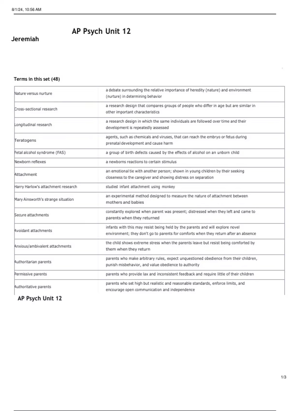 8/1/24, 10:56 AM 1/3 AP Psych Unit 12 Jeremiah Terms in this set (48) Nature versus nurture a debate surrounding the relative importance of heredity (nature) and environment (nurture) in determining behavior Cross-sectional research a research design that compares groups of people who differ in age but are similar in other important characteristics Longitudinal research a research design in which the same individuals are followed over time and their development is repeatedly assessed Teratogens agents, such as chemicals and viruses, that can reach the embryo or fetus during prenatal development and cause harm Fetal alcohol syndrome (FAS) a group of birth defects caused by the effects of alcohol on an unborn child Newborn reflexes a newborns reactions to certain stimulus Attachment an emotional tie with another person; shown in young children by their seeking closeness to the caregiver and showing distress on separation Harry Harlow's attachment research studied infant attachment using monkey Mary Ainsworth's strange situation an experimental method designed to measure the nature of attachment between mothers and babies Secure attachments constantly explored when parent was present; distressed when they left and came to parents when they returned Avoidant attachments infants with this may resist being held by the parents and will explore novel environment; they don't go to parents for comforts when they return after an absence Anxious/ambivalent attachments the child shows extreme stress when the parents leave but resist being comforted by them when they return Authoritarian parents parents who make arbitrary rules, expect unquestioned obedience from their children, punish misbehavior, and value obedience to authority Permissive parents parents who provide lax and inconsistent feedback and require little of their children Authoritative parents parents who set high but realistic and reasonable standards, enforce limits, and encourage open communication and independence AP Psych Unit 12