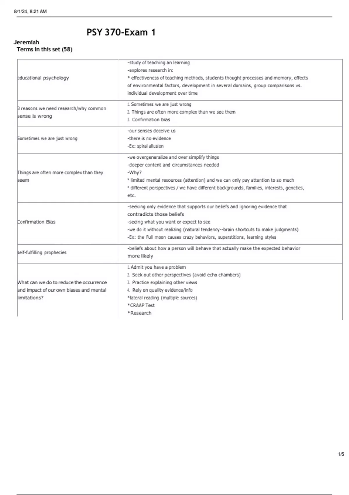 8/1/24, 8:21 AM 1/5 PSY 370-Exam 1 Jeremiah Terms in this set (58) educational psychology -study of teaching an learning -explores research in: * effectiveness of teaching methods, students thought processes and memory, effects of environmental factors, development in several domains, group comparisons vs. individual development over time 3 reasons we need research/why common sense is wrong 1. Sometimes we are just wrong 2. Things are often more complex than we see them 3. Confirmation bias Sometimes we are just wrong -our senses deceive us -there is no evidence -Ex: spiral allusion Things are often more complex than they seem -we overgeneralize and over simplify things -deeper content and circumstances needed -Why? * limited mental resources (attention) and we can only pay attention to so much * different perspectives / we have different backgrounds, families, interests, genetics, etc. Confirmation Bias -seeking only evidence that supports our beliefs and ignoring evidence that contradicts those beliefs -seeing what you want or expect to see -we do it without realizing (natural tendency --brain shortcuts to make judgments) -Ex: the Full moon causes crazy behaviors, superstitions, learning styles self-fulfilling prophecies -beliefs about how a person will behave that actually make the expected behavior more likely What can we do to reduce the occurrence and impact of our own biases and mental limitations? 1. Admit you have a problem 2. Seek out other perspectives (avoid echo chambers) 3. Practice explaining other views 4. Rely on quality evidence/info *lateral reading (multiple sources) *CRAAP Test *Research PSY 370-Exam 1 8/1/24, 8:21 AM PSY 370-Exam 1 https://quizlet.com/487626963/psy -370-exam -1-flash -cards/ 2/5 Why research is better than common sense? 1. systematic, planned, focused (no hind sight) 2. Replicated/repeatable studies 3. Larger, more diverse samples 4. Expertly reviewed/critiqued 5. more objective (though there is no perfect study--other factors, biases) Research and funding -before funding is given to schools/programs, effectiveness needs to be shown -research determines effectiveness -new programs receiving federal funds must have scientific evidence (NCLB and Race to the Top) Sample -a smaller group within a population -studying the entire population would be inefficient, if not impossible -Ex: population= all college students, sample = college students from UWL Convenience sample -using people nearby/easy access -problem = biased random selection -ideal -each person in population has an equal chance of being in sample -representative of entire population -produces generalization results Qualitative data -descriptions verbally or written -Ex: different types of ways kids fight, personal statement -Pros: measures richer info, gives deeper detail -Cons: Subjective, broad, takes longer Quantitative data -numbers -Ex: number of times kids fight -Pros: more objective, less bias, easier -Cons: only measured so much, not all things can be put into numbers Data Collection Techniques 1. self report 2. performance assessment 3. behavioral observation 4. physiological measurements Self report -ppts give info to questions asked -Pros: easy, fast, lots of info -Cons: bias, lies/deceit, poor ppt judgment, subjective Performance Assessment -researcher makes and watches ppts do something (ex: tells them to fix a car to test mechanic ability) -Pros: More objective -Cons: not always well designed or equitable Behavioral Observation -naturalistic= in natural habitat *Pros: real life example *Cons: observer bias, no control -laboratory = bring into to lab to test *Pros: control more variables *Cons: reactance (hawthorn effect), observer bias Physiological measure -physical: BP, HR, bodily fluid, sweat, etc -Pros: reliable, objective, involuntary results -Cons: not always indicative of what they think (ex: sweat from being nervous vs sweat from lying)
