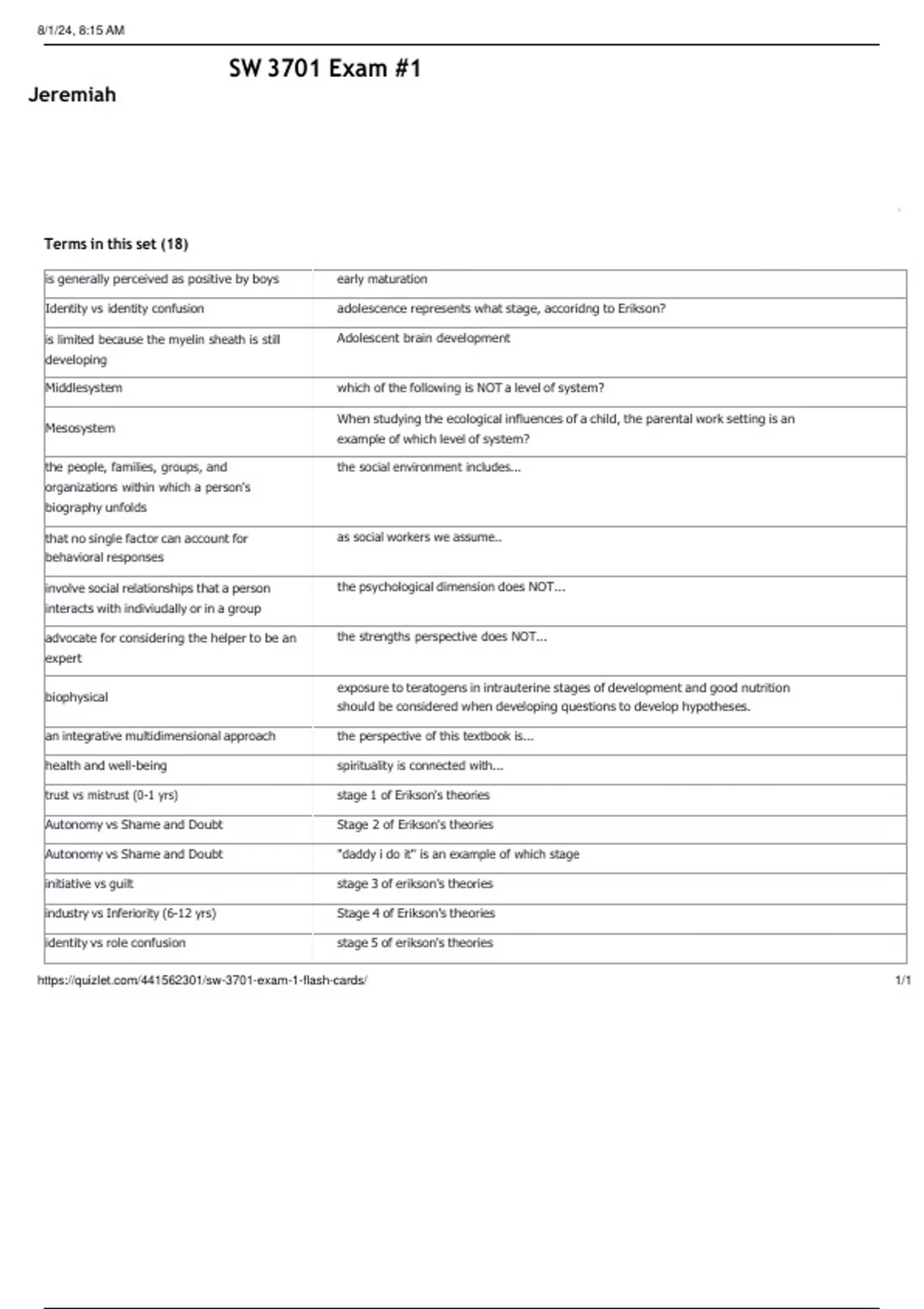 8/1/24, 8:15 AM SW 3701 Exam #1 Jeremiah Terms in this set (18) is generally perceived as positive by boys early maturation Identity vs identity confusion adolescence represents what stage, accoridng to Erikson? is limited because the myelin sheath is still developing Adolescent brain development Middlesystem which of the following is NOT a level of system? Mesosystem When studying the ecological influences of a child, the parental work setting is an example of which level of system? the people, families, groups, and organizations within which a person's biography unfolds the social environment includes... that no single factor can account for behavioral responses as social workers we assume.. involve social relationships that a person interacts with indiviudally or in a group the psychological dimension does NOT... advocate for considering the helper to be an expert the strengths perspective does NOT... biophysical exposure to teratogens in intrauterine stages of development and good nutrition should be considered when developing questions to develop hypotheses. an integrative multidimensional approach the perspective of this textbook is... health and well-being spirituality is connected with... trust vs mistrust (0 -1 yrs) stage 1 of Erikson's theories Autonomy vs Shame and Doubt Stage 2 of Erikson's theories Autonomy vs Shame and Doubt "daddy i do it" is an example of which stage initiative vs guilt stage 3 of erikson's theories industry vs Inferiority (6-12 yrs) Stage 4 of Erikson's theories identity vs role confusion stage 5 of erikson's theories https://quizlet.com/441562301/sw -3701 -exam -1-flash -cards/ 1/1