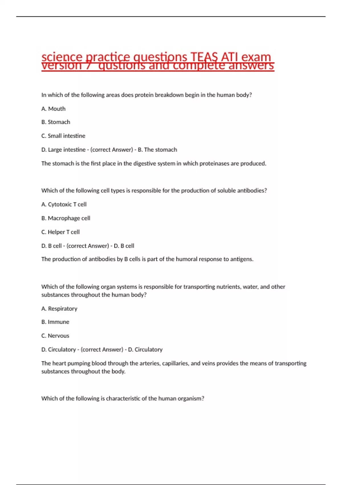 science practice questions TEAS ATI exam version 7 qustions and complete answers In which of the following areas does protein breakdown begin in the human body? A. Mouth B. Stomach C. Small intestine D. Large intestine - (correct Answer) - B. The stomach The stomach is the first place in the digestive system in which proteinases are produced. Which of the following cell types is responsible for the production of soluble antibodies? A. Cytotoxic T cell B. Macrophage cell C. Helper T cell D. B cell - (correct Answer) - D. B cell The production of antibodies by B cells is part of the humoral response to antigens.