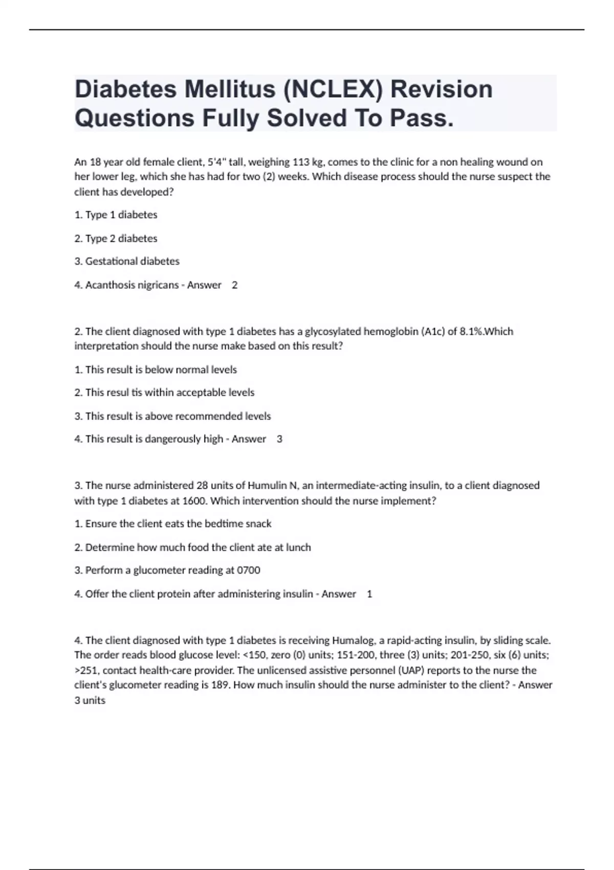 4. The client diagnosed with type 1 diabetes is receiving Humalog, a rapid-acting insulin, by sliding scale. The order reads blood glucose level: <150, zero (0) units; 151-200, three (3) units; 201-250, six (6) units; >251, contact health-care provider. The unlicensed assistive personnel (UAP) reports to the nurse the client's glucometer reading is 189. How much insulin should the nurse administer to the client? - Answer 3 units 5. The ruse is discussing the importance of exercising with a client diagnosed with type 2 diabetes whose