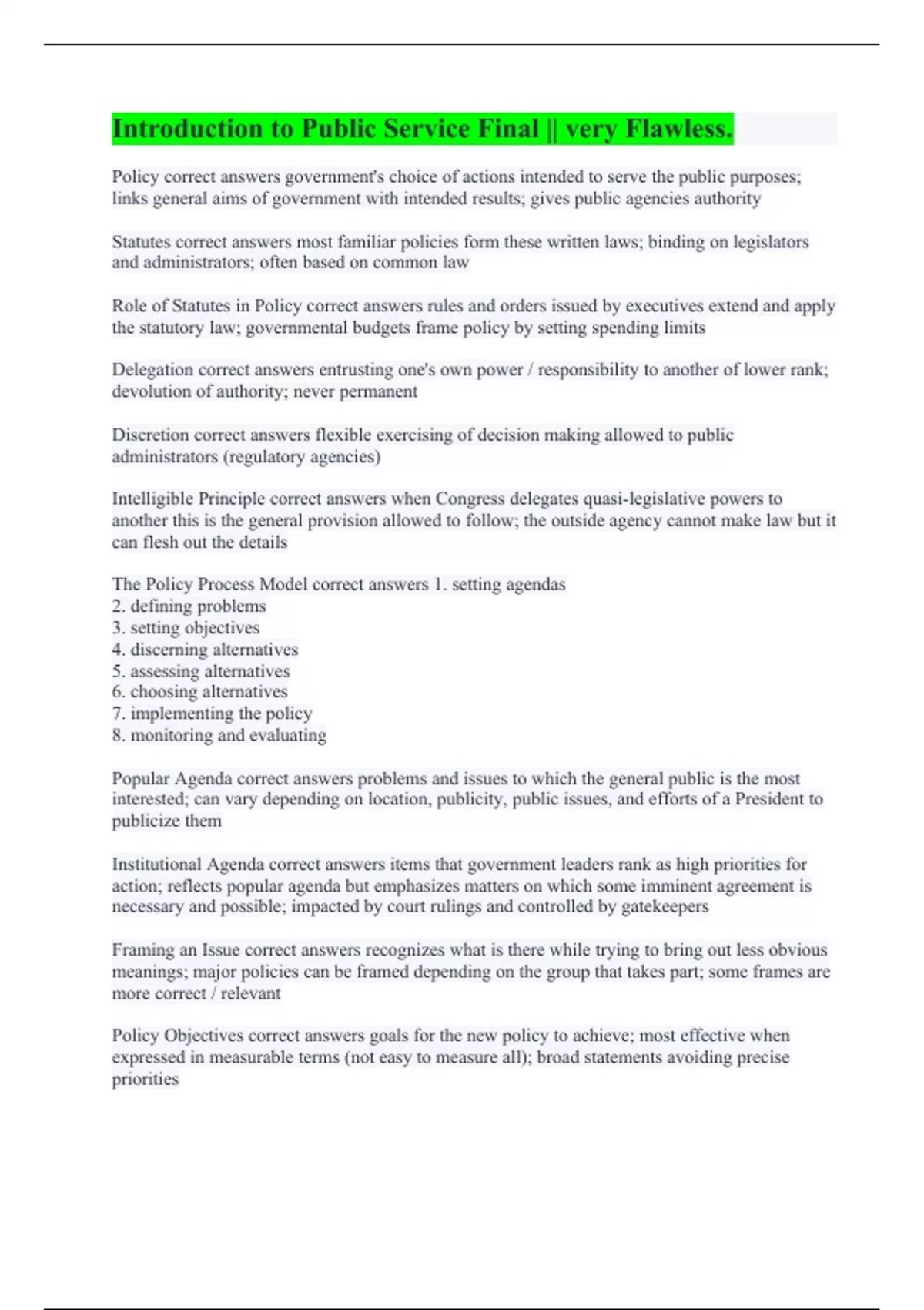 Policy correct answers government's choice of actions intended to serve the public purposes; links general aims of government with intended results; gives public agencies authority Statutes correct answers most familiar policies form these written laws; binding on legislators and administrators; often based on common law Role of Statutes in Policy correct answers rules and orders issued by executives extend and apply the statutory law; governmental budgets frame policy by setting spending limits Delegation correct answers entrusting one's own power / responsibility to another of lower rank; devolution of authority; never permanent Discretion correct answers flexible exercising of decision making allowed to public administrators (regulatory agencies) Intelligible Principle correct answers when Congress delegates quasi-legislative powers to another this is the general provision allowed to follow; the outside agency cannot make law but it can flesh out the details The Policy Process Model correct answers 1. setting agendas 2. defining problems 3. setting objectives 4. discerning alternatives 5. assessing alternatives 6. choosing alternatives 7. implementing the policy 8. monitoring and evaluating Popular Agenda correct answers problems and issues to which the general public is the most interested; can vary depending on location, publicity, public issues, and efforts of a President to publicize them Institutional Agenda correct answers items that government leaders rank as high priorities for action; reflects popular agenda but emphasizes matters on which some imminent agreement is necessary and possible; impacted by court rulings and controlled by gatekeepers Framing an Issue correct answers recognizes what is there while trying to bring out less obvious meanings; major policies can be framed depending on the group that takes part; some frames are more correct / relevant Policy Objectives correct answers goals for the new policy to achieve; most effective when expressed in measurable terms (not easy to measure all); broad statements avoiding precise priorities