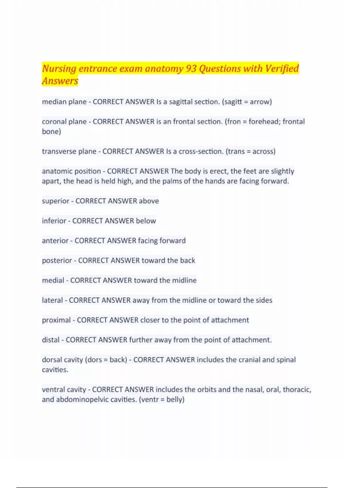 Nursing Entrance Exam (Anatomy). QUESTIONS WITH 100% VERIFIED ANSWERS 2024