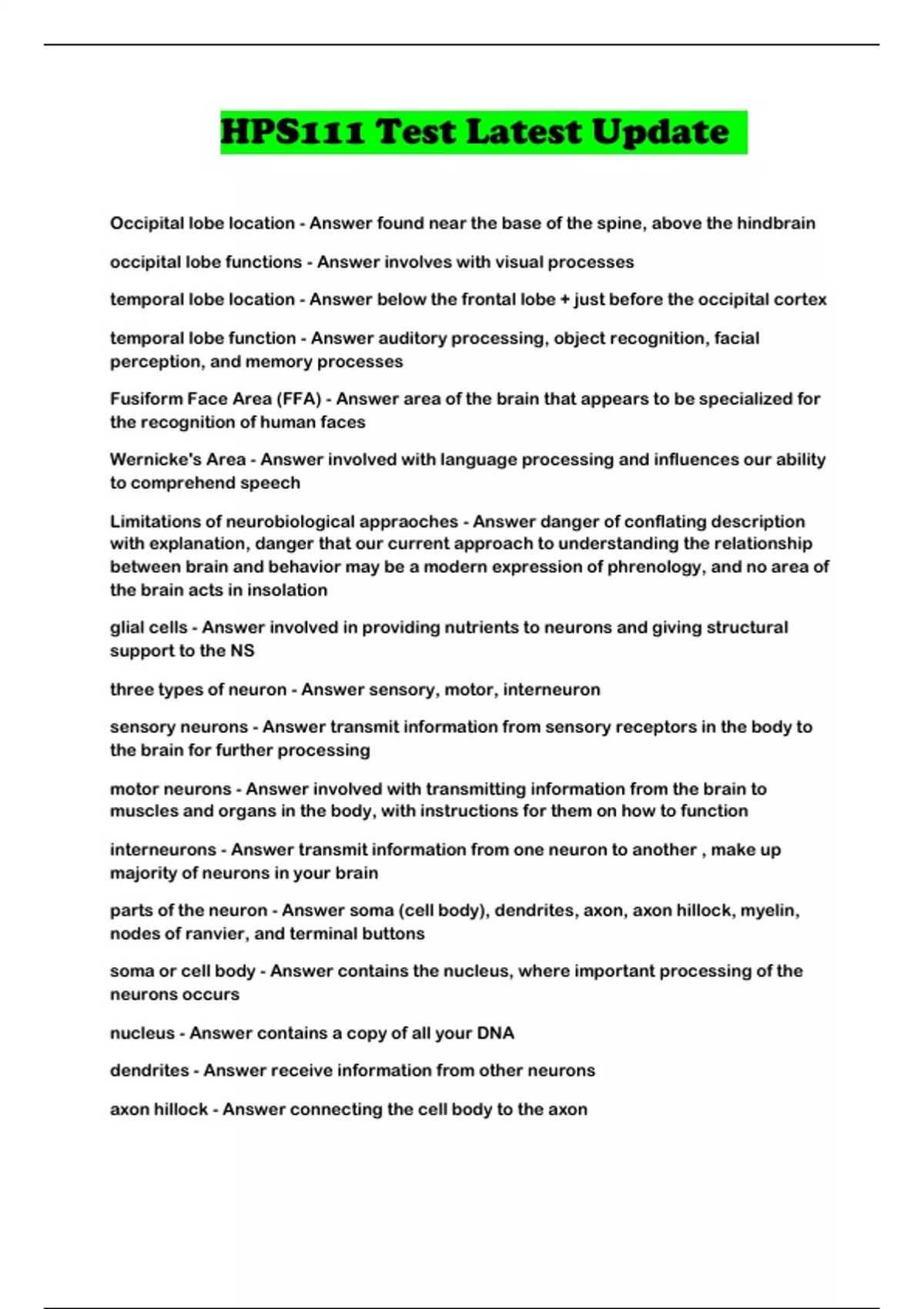 HPS111 Test Latest Update Occipital lobe location - Answer found near the base of the spine , above the hindbrain occipital lobe functions - Answer involves with visual processes temporal lobe location - Answer below the frontal lobe + just befor e the occipital cortex temporal lobe function - Answer auditory processing, object reco gnition, facial perception, and memory processes Fusiform Face Area (FFA) - Answer area of the brain that appears to be specialized for the recognition of human faces Wernicke's Area - Answer involved with language processing and inf luences our ability to comprehend speech Limitations of neurobiological appraoches - Answer danger of c onflating description with explanation, danger that our current approach to underst anding the relationship between brain and behavior may be a modern expression of phr enology, and no area of the brain acts in insolation glial cells - Answer involved in providing nutrients to neurons an d giving structural support to the NS three types of neuron - Answer sensory, motor, interneuron sensory neurons - Answer transmit information from sensory recepto rs in the body to the brain for further processing motor neurons - Answer involved with transmitting information fro m the brain to muscles and organs in the body, with instructions for them on how t o function interneurons - Answer transmit information from one neuron to an other , make up majority of neurons in your brain parts of the neuro n - Answer soma (cell body), dendrites, axon, axon hillock, myelin, nodes of ranvier, and terminal buttons soma or cell body - Answer contains the nucleus, where importa nt processing of the neurons occurs nucleus - Answer contains a copy of all your DNA dendrites - Answer receive information from other neurons axon hillock - Answer connecting the cell body to the axon axon - Answer responsible for transmitting electrical signals from th e cell body through to the terminal buttons terminal buttons - Answer where information is conveyed to other neurons mylein - Answer white fatty tissue substain produced by subtype s of glial cells that covers the axon and insulates the electrical signal that is being transmitted through the axon nodes of ranvier - Answer section of the axon not covered in mye lin, along with the axon hillock this is where action potentials occur action potentials - Answer process that propagates an electr ical signal from the axon hillock to the end of the neuron to allow information to be transm itted to the dendrites of the next cell synapse - Answer small gap between neurons, where the chemicals are released from the terminal buttons on one neuron to communicate a new signal to the dendrites on the next neuron different classifcations of neurons - Answer unipolar, bipolar , pseudounipolar, multipolar unipolar neuron - Answer has one projection from teh cell bo dy which can sometime be a dendrite or an axon, depending on its function bipolar neuron - Answer known for important role in the visual s ystem, has two projections multipolar neuron - Answer most common neuron, prototypica l neuron Pseudounipolar neuron - Answer has one projection from the c ell body but still comprised of both dendrites and an axon cerebral cortex - Answer involved in the processing of information grey matter (of the brain) - Answer comprised of cell bodies and d endrites of neurons - located on the outside white matter (of the brain) - Answer myelinated axons corpus callosum - Answer allows communication between the brai n hemispheres - white matter Step A - neurons - Answer involves understanding how the dendr ites and cell body of a neuron received information from other nearby neurons Step B - neurons - Answer invovles understanding the process by which information travels from the axon hilock to the terminal buttons of the n euron