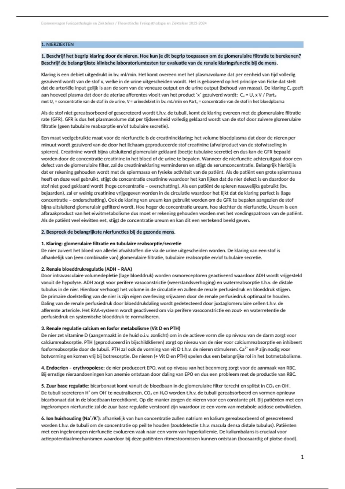 1. Klaring: glomerulaire filtratie en tubulaire reabsorptie/secretie