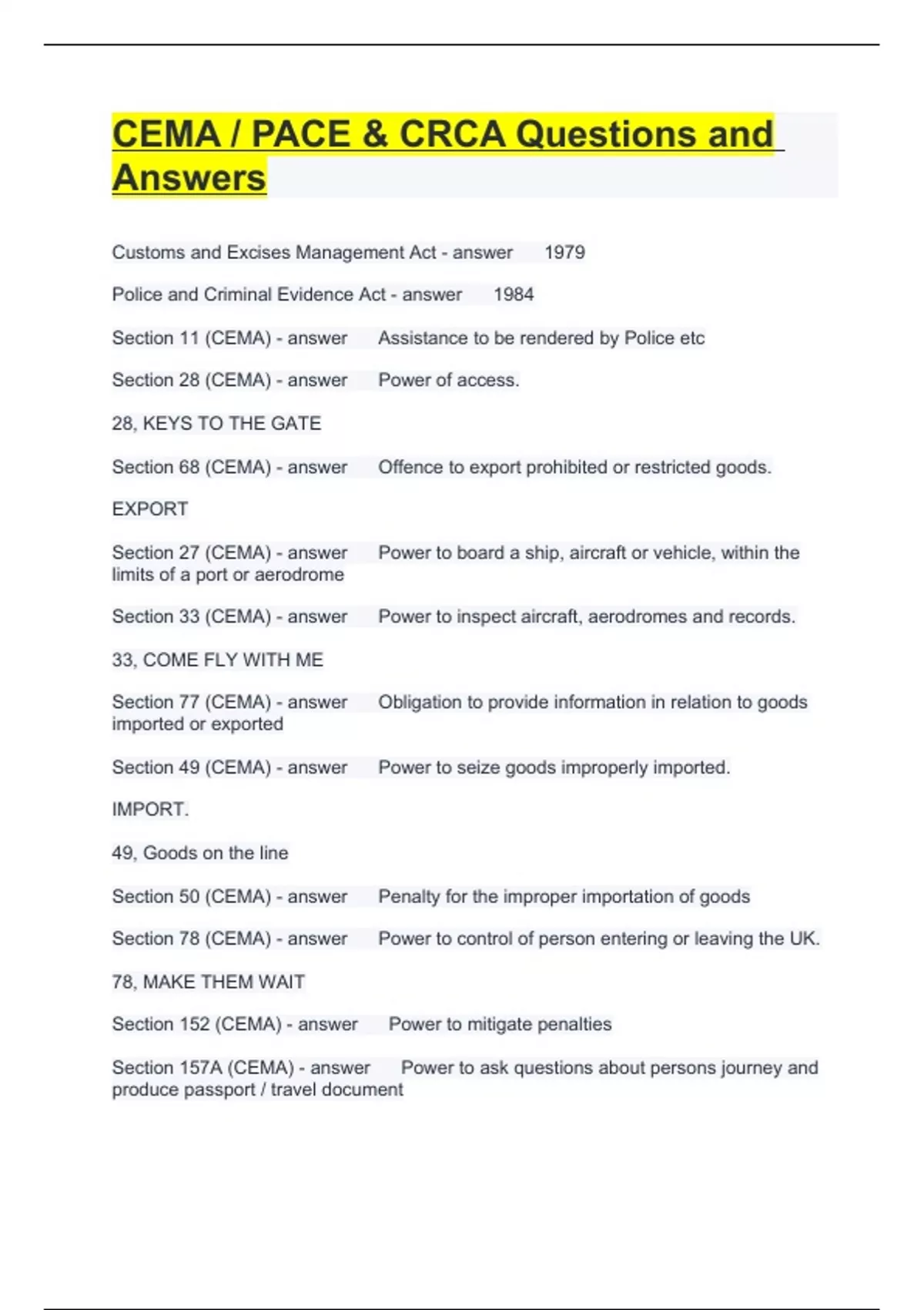 Section 78 (CEMA) - answer Power to control of person entering or leaving the UK.