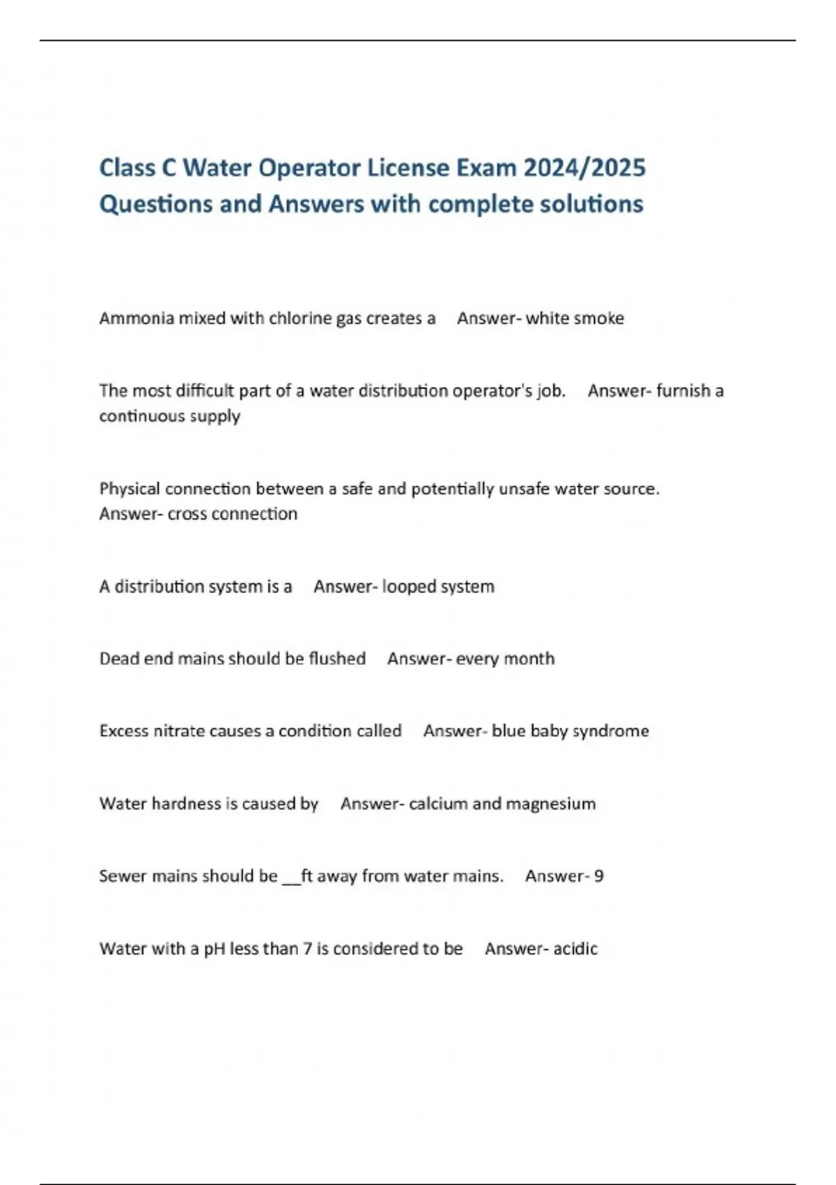Class C Water Operator License Exam 2024/2025 Questions and Answers with complete solutions