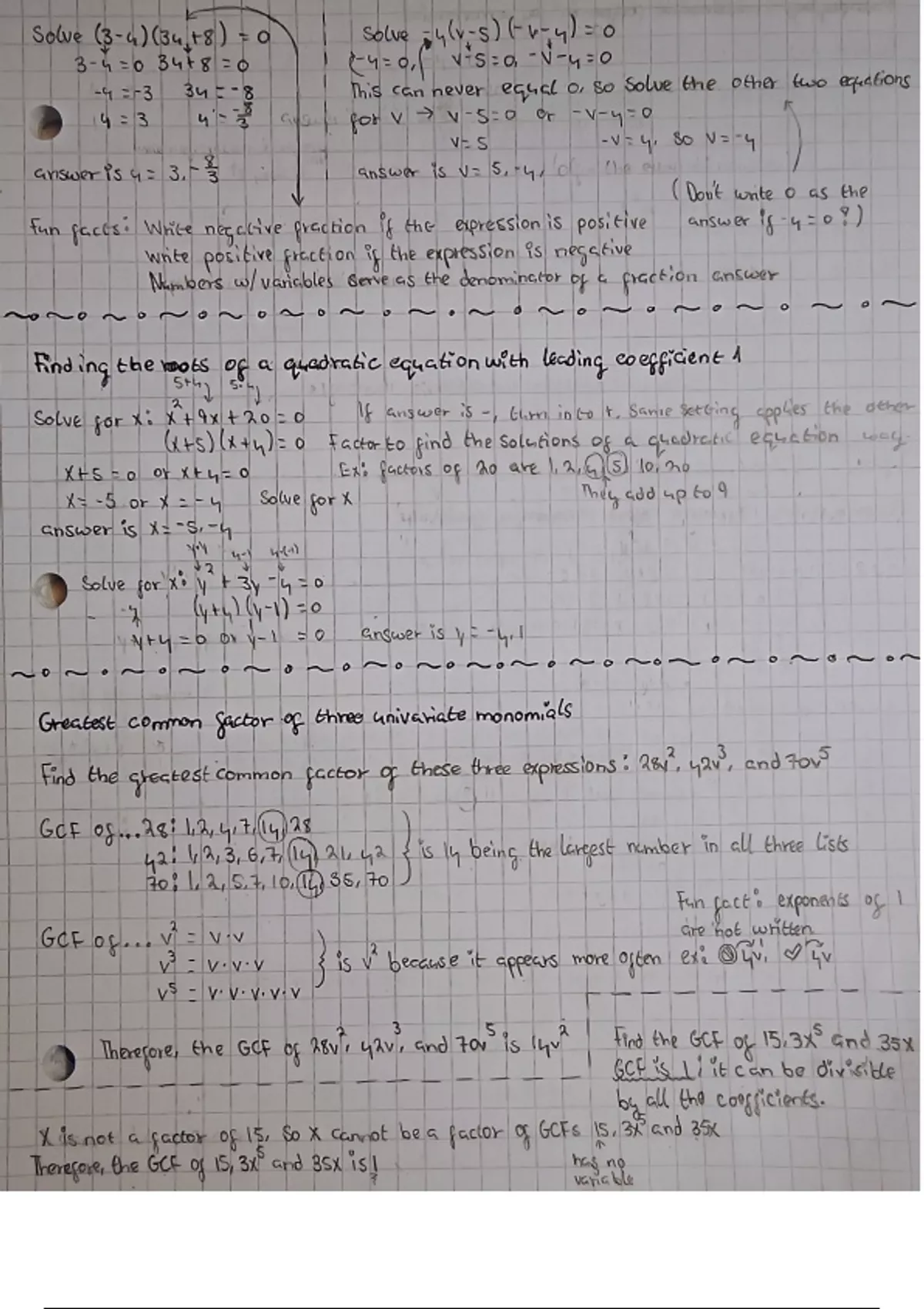 Finding the roots of a quadratic equation with leading coefficient 1 | Greatest common factor of three univariate monomials | Find the greatest common factor of three expressions