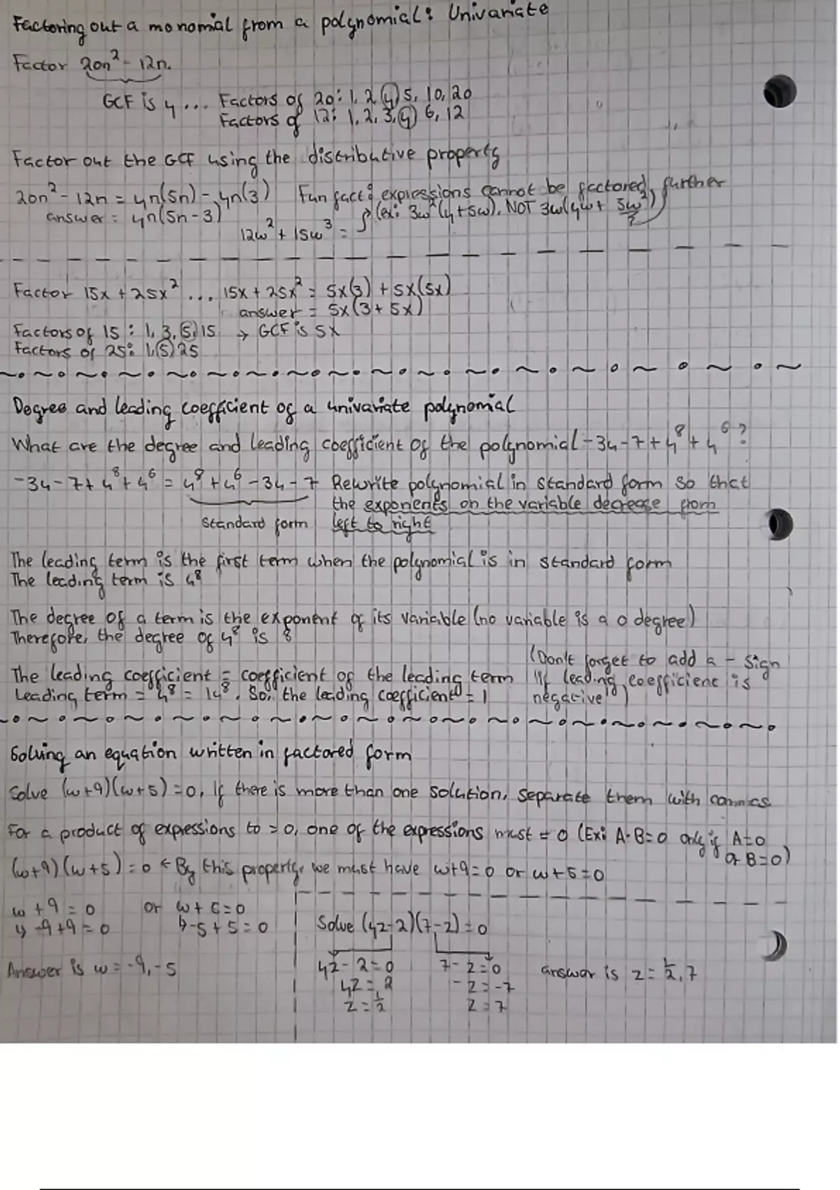 Factoring out a monomial from a polynomial: Univariate | Degree and leading coefficient of a univariate polynomial | Solving an equation written in factored form | Factor out the GCF using the distributive property