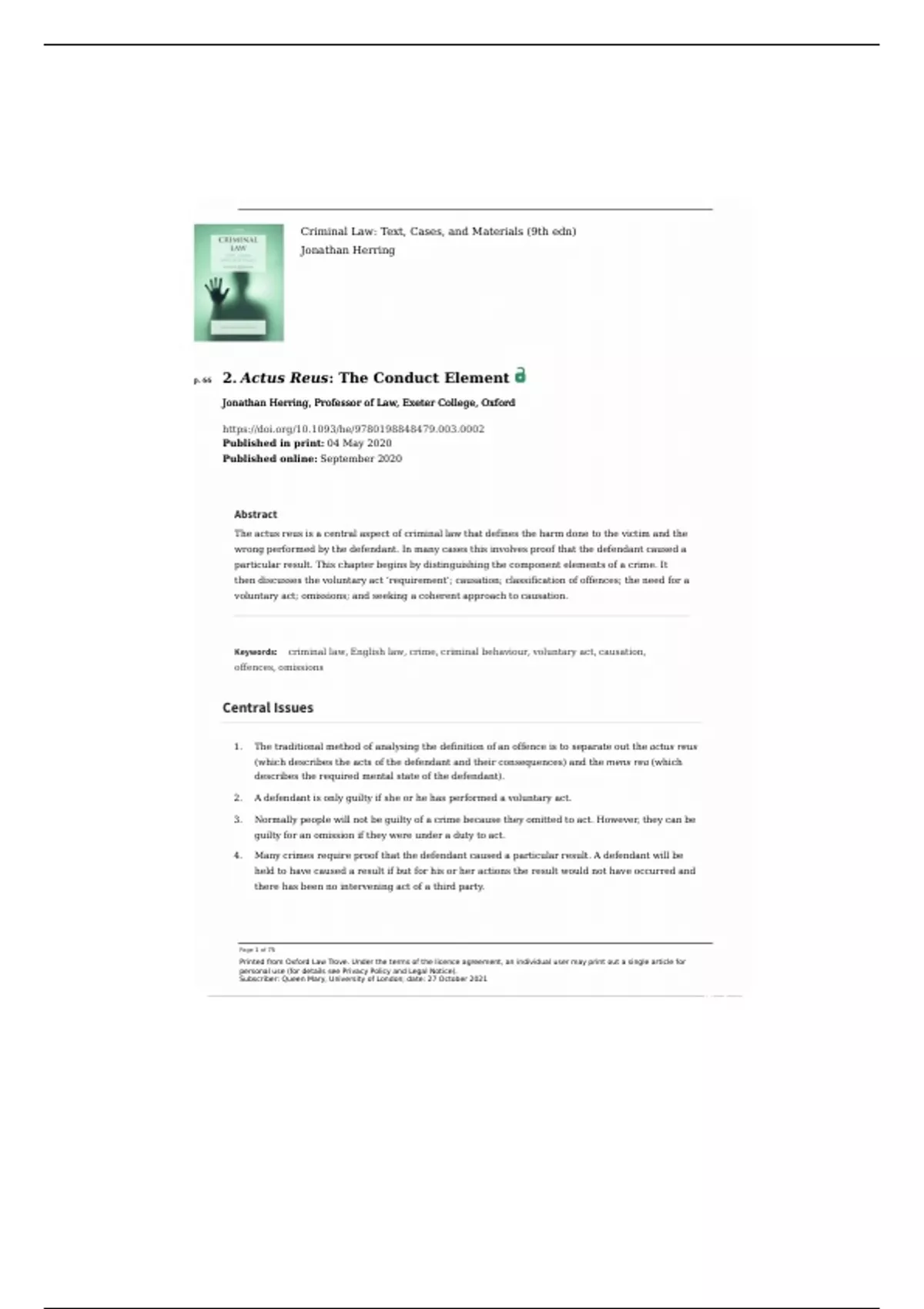 Keywords: criminal law, English law, crime, criminal behaviour, voluntary act, causation,