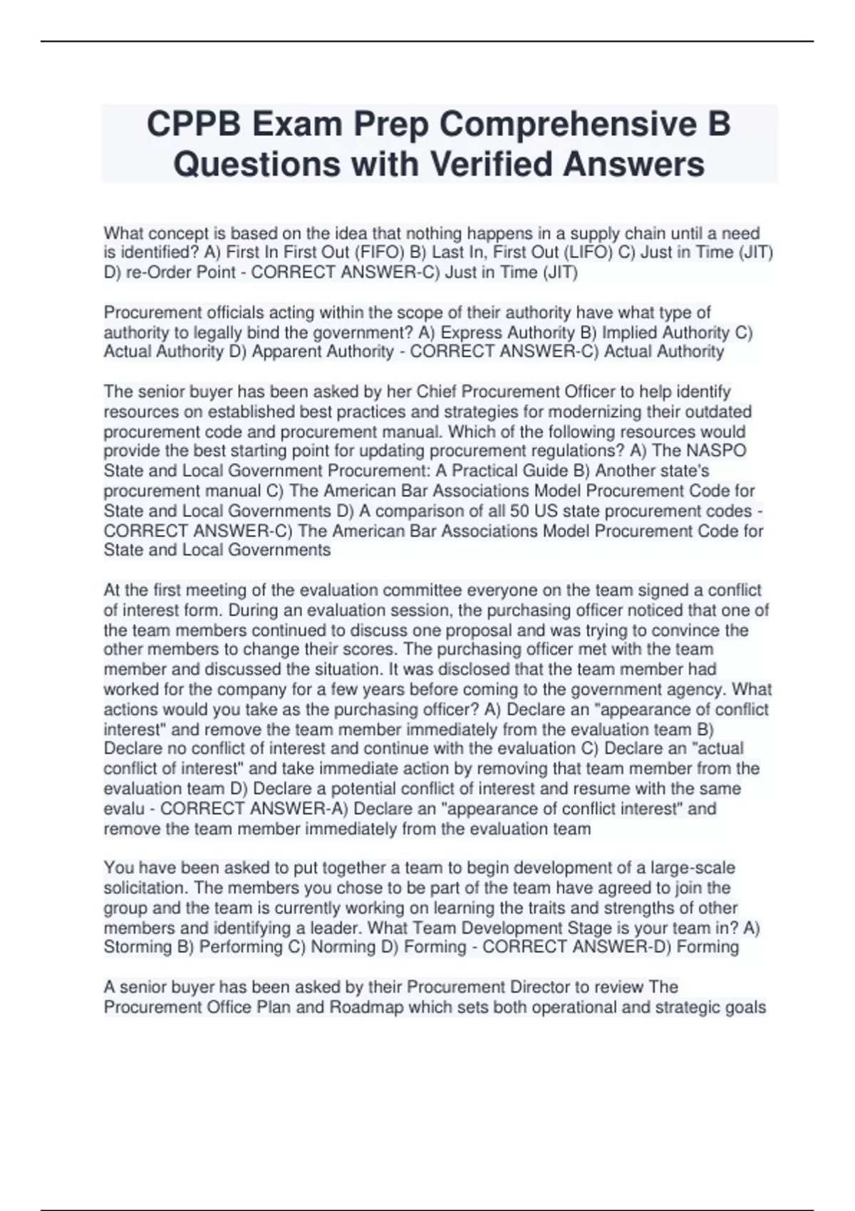 CPPB Exam Prep Comprehensive B Questions with Verified Answers What concept is based on the idea that nothing happens in a supply chain until a need is identified? A) First In First Out (FIFO) B) Last In, First Out (LIFO) C) Just in Time (JIT) D) re-Order Point - CORRECT ANSWER-C) Just in Time (JIT) Procurement officials acting within the scope of their authority have what type of authority to legally bind the government? A) Express Authority B) Implied Authority C) Actual Authority D) Apparent Authority - CORRECT ANSWER-C) Actual Authority The senior buyer has been asked by her Chief Procurement Officer to help identify resources on established best practices and strategies for modernizing their outdated procurement code and procurement manual. Which of the following resources would provide the best starting point for updating procurement regulations? A) The NASPO State and Local Government Procurement: A Practical Guide B) Another state's procurement manual C) The American Bar Associations Model Procurement Code for State and Local Governments D) A comparison of all 50 US state procurement codes - CORRECT ANSWER-C) The American Bar Associations Model Procurement Code for State and Local Governments At the first meeting of the evaluation committee everyone on the team signed a conflict of interest form. During an evaluation session, the purchasing officer noticed that one of the team members continued to discuss one proposal and was trying to convince the other members to change their scores. The purchasing officer met with the team member and discussed the situation. It was disclosed that the team member had worked for the company for a few years before coming to the government agency. What actions would you take as the purchasing officer? A) Declare an "appearance of conflict interest" and remove the team member immediately from the evaluation team B) Declare no conflict of interest and continue with the evaluation C) Declare an "actual conflict of interest" and take immediate action by removing that team member from the evaluation team D) Declare a potential conflict of interest and resume with the same evalu - CORRECT ANSWER-A) Declare an "appearance of conflict interest" and remove the team member immediately from the evaluation team You have been asked to put together a team to begin development of a large-scale solicitation. The members you chose to be part of the team have agreed to join the group and the team is currently working on learning the traits and strengths of other members and identifying a leader. What Team Development Stage is your team in? A) Storming B) Performing C) Norming D) Forming - CORRECT ANSWER-D) Forming A senior buyer has been asked by their Procurement Director to review The Procurement Office Plan and Roadmap which sets both operational and strategic goals