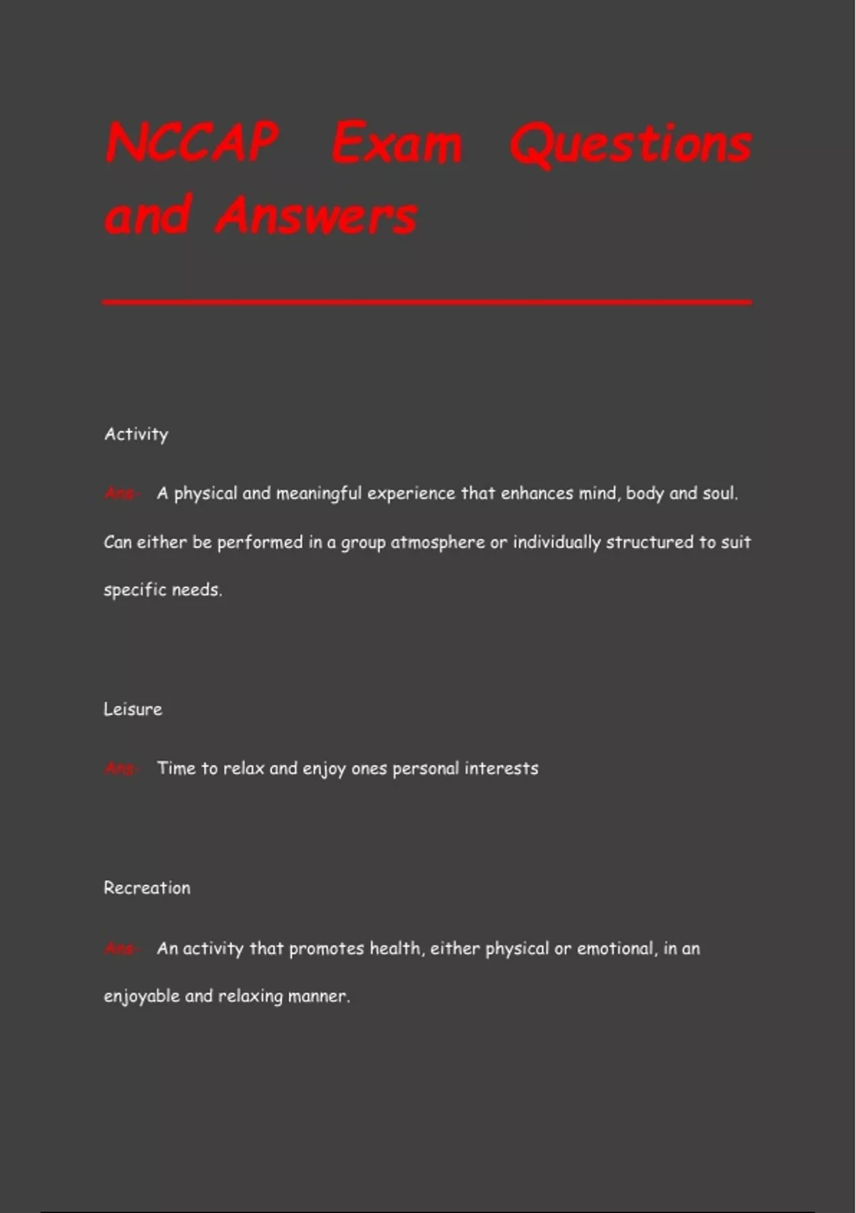 Activity Ans- A physical and meaningful experience that enhances mind, body and soul. Can either be performed in a group atmosphere or individually structured to suit specific needs. Leisure Ans- Time to relax and enjoy ones personal interests Recreation Ans- An activity that promotes health, either physical or emotional, in an enjoyable and relaxing manner. Continuum of Care Ans- Facilities that one can attend or reside in that offer services for a specific need. Organization Ans- A structure united with a mutual need in mind. The second managerial function. The grouping of activities and resources into organizational units, such as departments or sections, and staffing these departments to accomplish the work of the organization. Chain of Command Ans- Starts with someone in charge such as an administrator. Advisement is passed down from the administrator to the staff through the department heads. Organizational Ch
