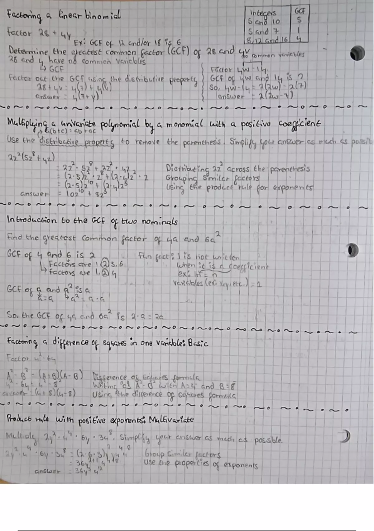 Factoring a linear binomial | Multiplying a univariate polynomial by a monomial with a positive coefficient | Introduction to the GCF of two nominals | Factoring a difference of squares in one variable: Basic | Product rule with positive exponents: Multivariate