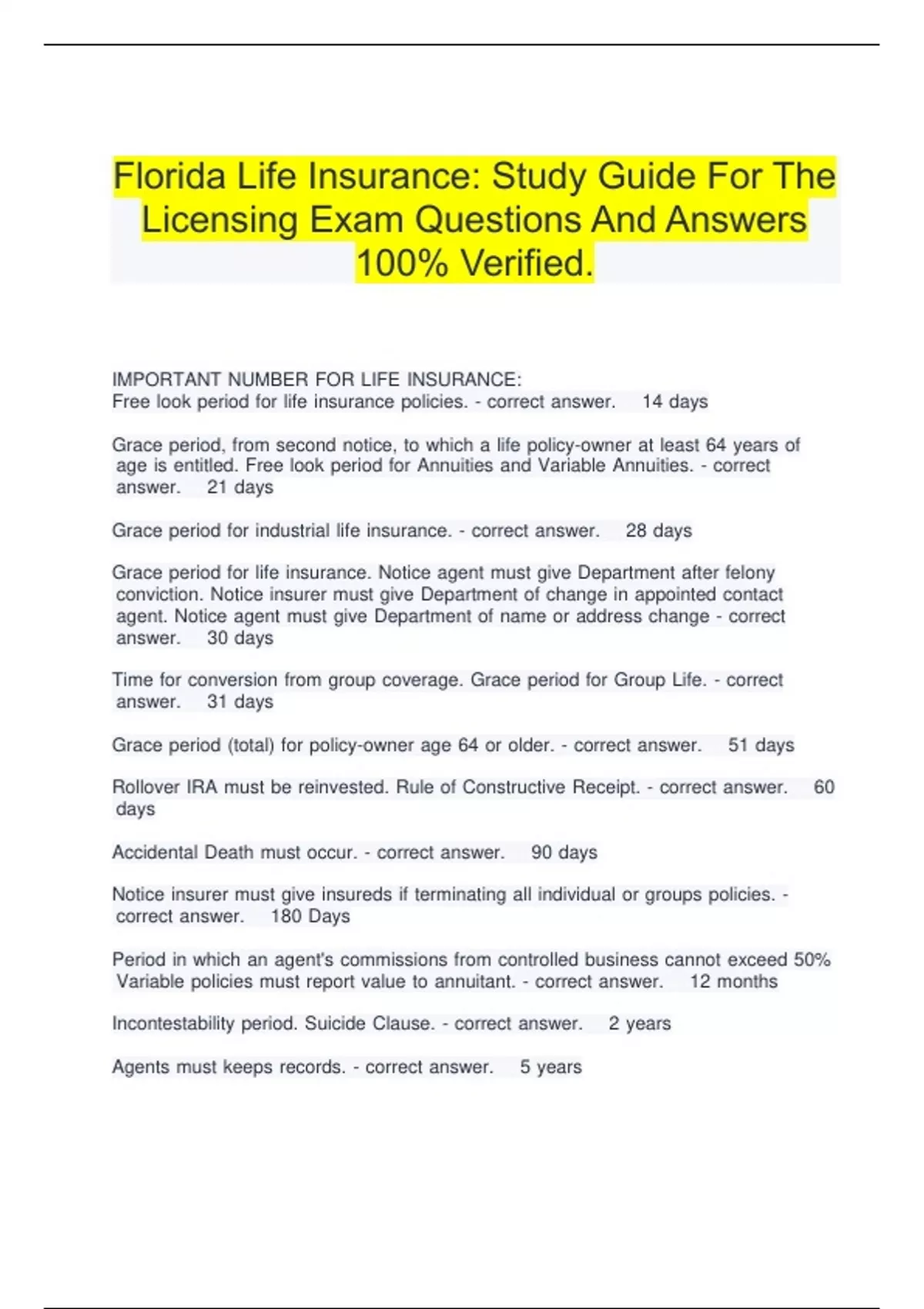 Florida Life Insurance: Study Guide For The Licensing Exam Questions And Answers 100% Verified.