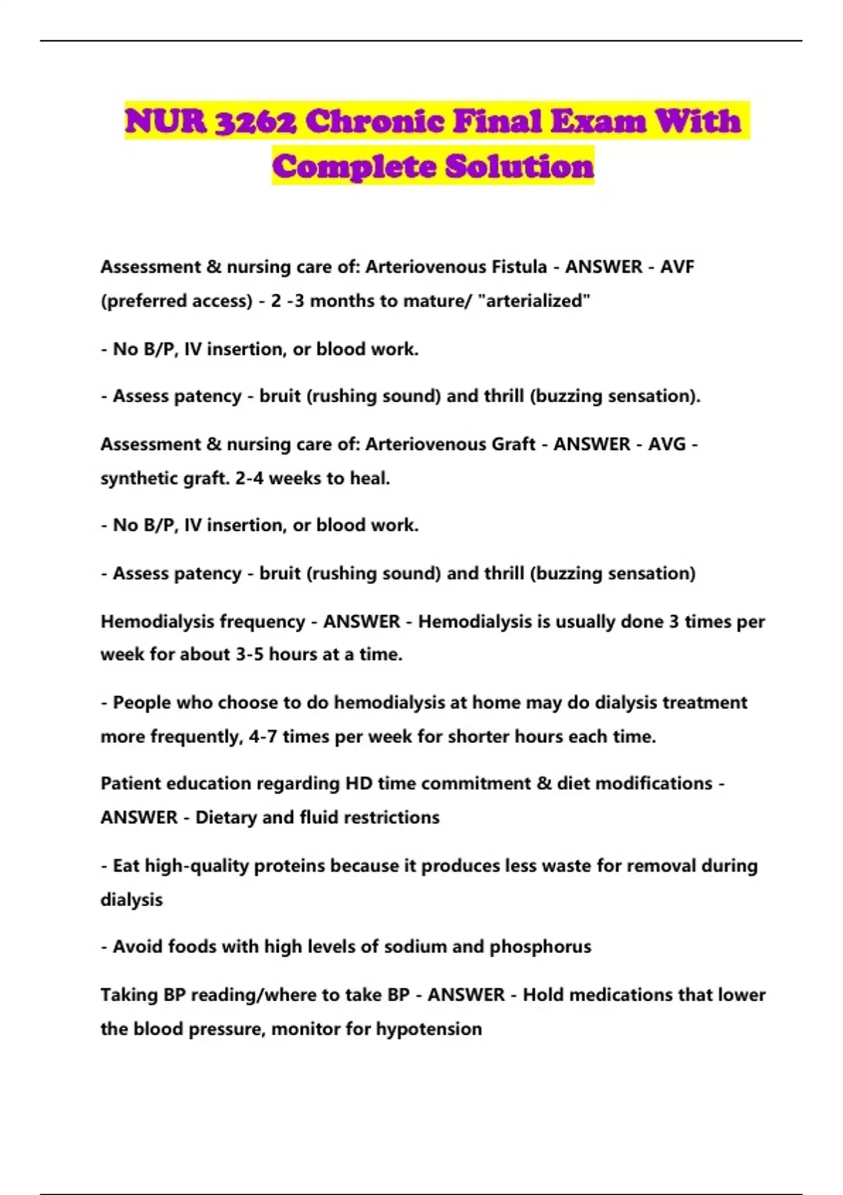 NUR 3262 Chronic Final Exam With
