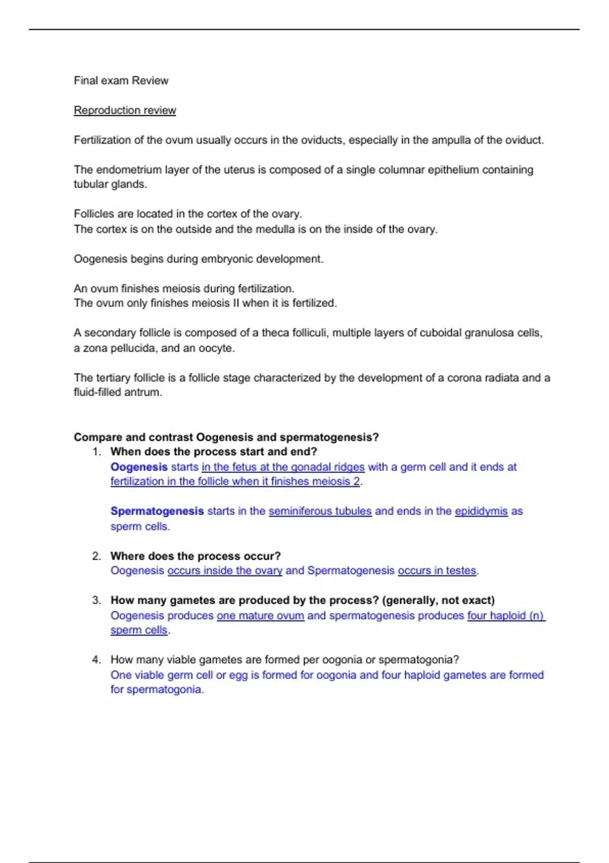 Compare and contrast Oogenesis and spermatogenesis?