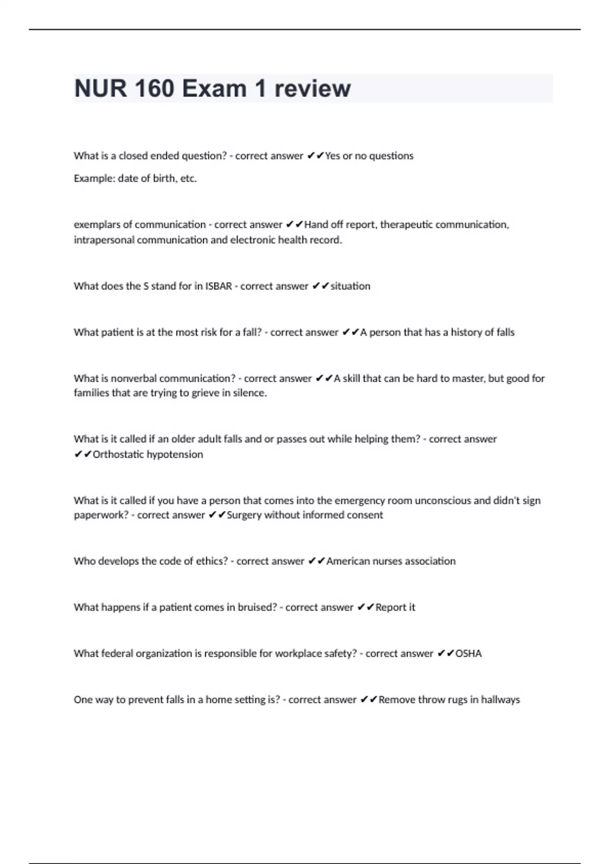 One way to prevent falls in a home setting is? - correct answer ✔✔Remove throw rugs in hallways