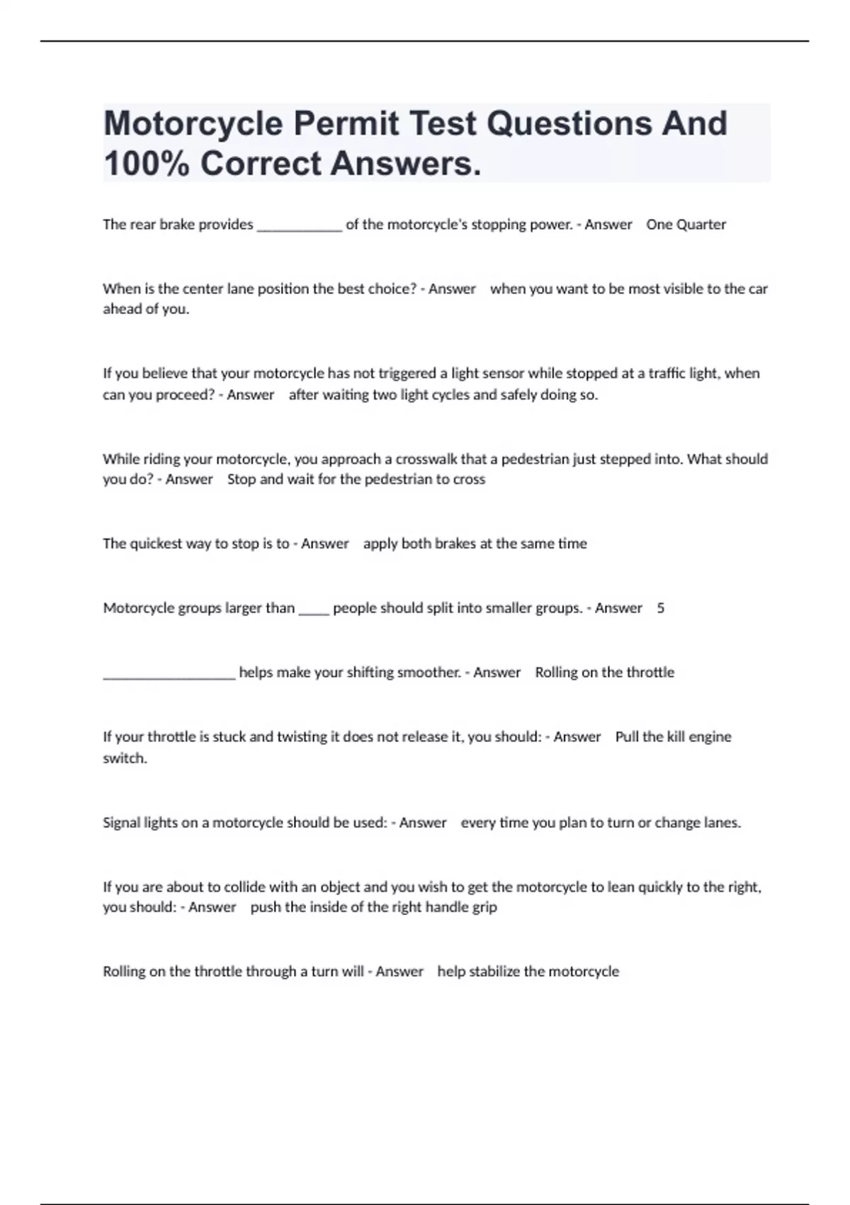 Motorcycle Permit Test Questions And 100% Correct Answers.