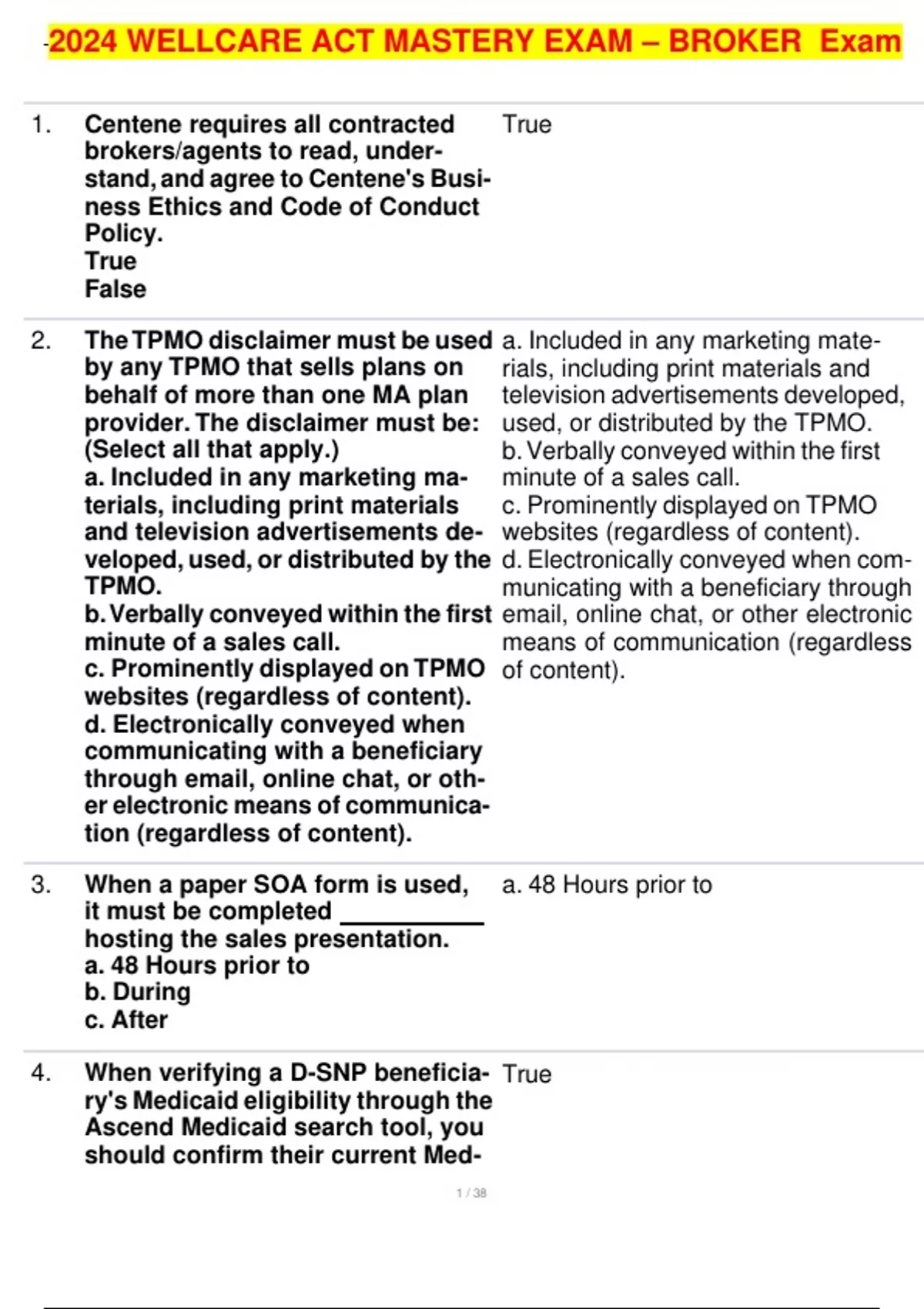2024 WELLCARE ACT MASTERY EXAM – BROKER Exam 1. Centene requires all contracted brokers/agents to read, under- stand, and agree to Centene's Busi- ness Ethics and Code of Conduct Policy. True False 2. The TPMO disclaimer must be used by any TPMO that sells plans on behalf of more than one MA plan provider. The disclaimer must be: (Select all that apply.) a. Included in any marketing ma- terials, including print materials and television advertisements de- veloped, used, or distributed by the TPMO. b. Verbally conveyed within the first minute of a sales call. c. Prominently displayed on TPMO websites (regardless of content). d. Electronically conveyed when communicating with a beneficiary through email, online chat, or oth- er electronic means of communica- tion (regardless of content). 3. When a paper SOA form is used, it must be completed hosting the sales presentation. a. 48 Hours prior to b. During c. After 4. When verifying a D-SNP beneficia- ry's Medicaid eligibility through the Ascend Medicaid search tool, you should confirm their current Med- True a. Included in any marketing mate- rials, including print materials and television advertisements developed, used, or distributed by t