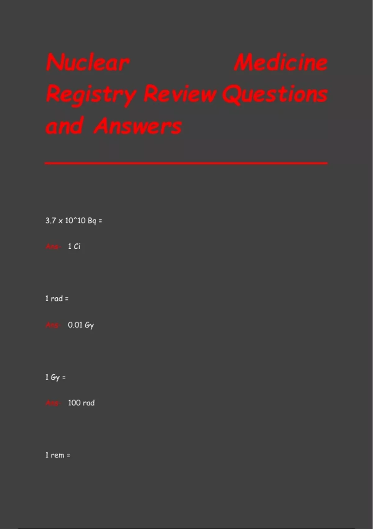 3.7 x 10^10 Bq = Ans- 1 Ci 1 rad = Ans- 0.01 Gy 1 Gy = Ans- 100 rad 1 rem = Ans- 0.01 Sv 1 Sv = Ans- 100 rem 1 mCi = Ans- 37 mBq Another name for mertiatiade is... Ans- MAG3 Another name for mercaptoacetyl triglycine is... Ans- MAG3 What type kidney imaging is MAG3 used for? (Two words) Ans- tubular secretion Another name for pentatate is... Ans- DTPA What type of kidney imaging is DTPA used for? Ans- GFR