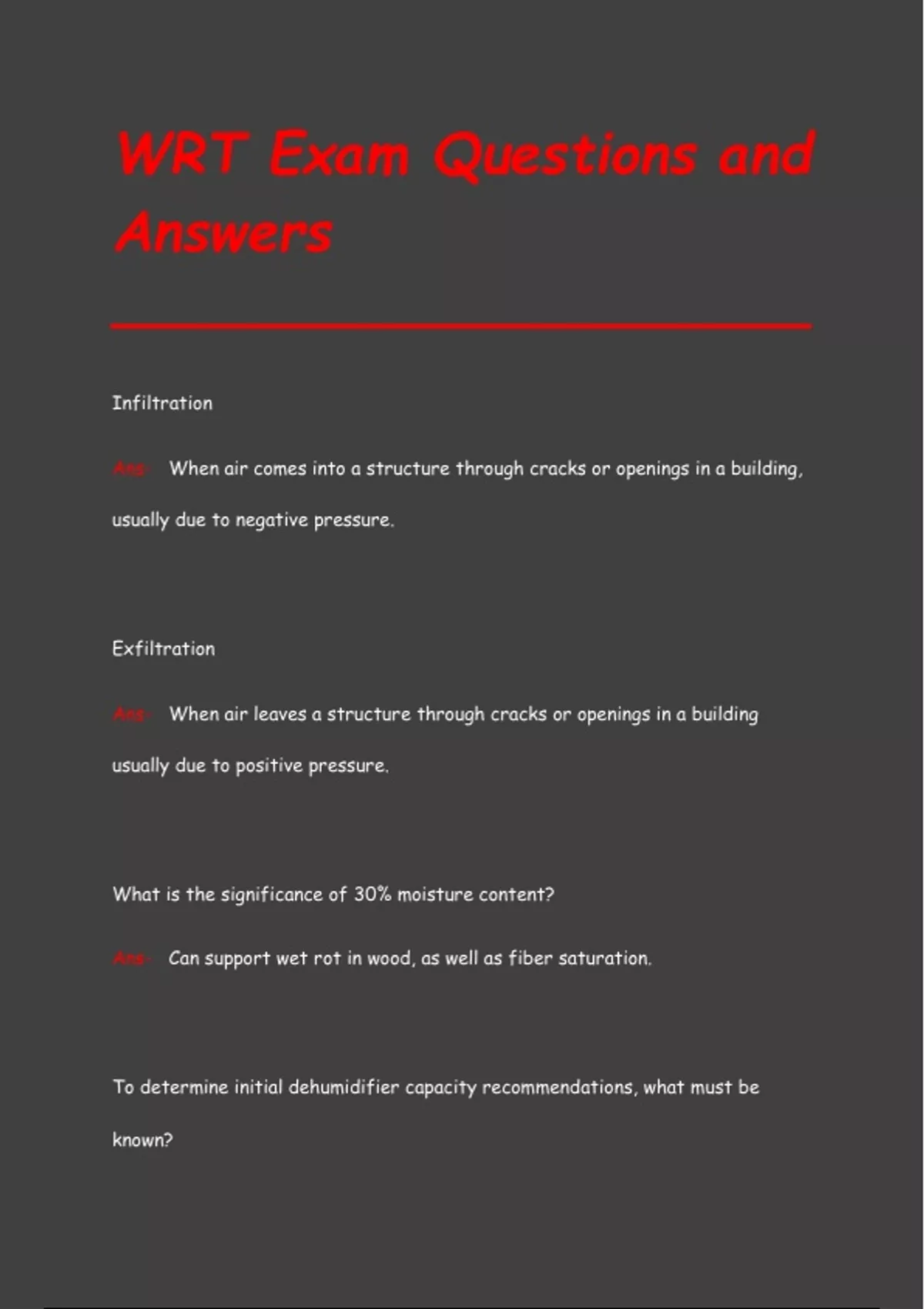 Infiltration Ans- When air comes into a structure through cracks or openings in a building, usually due to negative pressure. Exfiltration Ans- When air leaves a structure through cracks or openings in a building usually due to positive pressure. What is the significance of 30% moisture content? Ans- Can support wet rot in wood, as well as fiber saturation. To determine initial dehumidifier capacity recommendations, what must be known? Ans- Cubic feet, class of water, Dehumidifier type. What two documents det