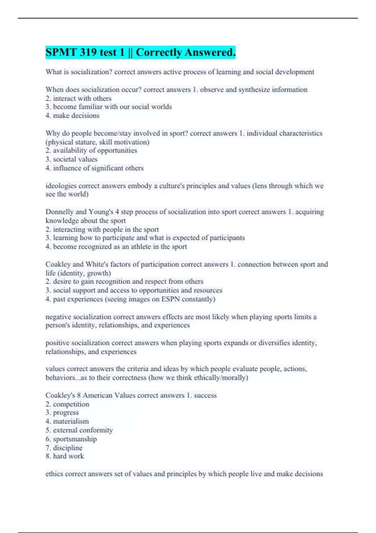 What is socialization? correct answers active process of learning and social development When does socialization occur? correct answers 1. observe and synthesize information 2. interact with others 3. become familiar with our social worlds 4. make decisions Why do people become/stay involved in sport? correct answers 1. individual characteristics (physical stature, skill motivation) 2. availability of opportunities 3. societal values 4. influence of significant others ideologies correct answers embody a culture's principles and values (lens through which we see the world) Donnelly and Young's 4 step process of socialization into sport correct answers 1. acquiring knowledge about the sport 2. interacting with people in the sport 3. learning how to participate and what is expected of participants 4. become recognized as an athlete in the sport Coakley and White's factors of participation correct answers 1. connection between sport and life (identity, growth) 2. desire to gain recognition and respect from others 3. social support and access to opportunities and resources 4. past experiences (seeing images on ESPN constantly) negative socialization correct answers effects are most likely when playing sports limits a person's identity, relationships, and experiences positive socialization correct answers when playing sports expands or diversifies identity, relationships, and experiences values correct answers the criteria and ideas by which people evaluate people, actions, behaviors...as to their correctness (how we think ethically/morally) Coakley's 8 American Values correct answers 1. success 2. competition 3. progress 4. materialism 5. external conformity 6. sportsmanship 7. discipline 8. hard work ethics correct answers set of values and principles by which people live and make decisions