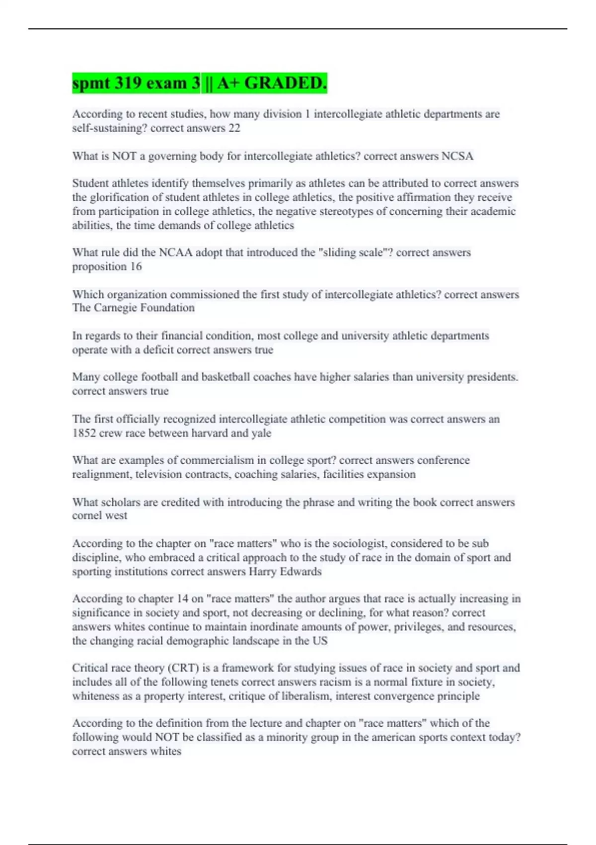 According to recent studies, how many division 1 intercollegiate athletic departments are self-sustaining? correct answers 22 What is NOT a governing body for intercollegiate athletics? correct answers NCSA Student athletes identify themselves primarily as athletes can be attributed to correct answers the glorification of student athletes in college athletics, the positive affirmation they receive from participation in college athletics, the negative stereotypes of concerning their academic abilities, the time demands of college athletics What rule did the NCAA adopt that introduced the "sliding scale"? correct answers proposition 16 Which organization commissioned the first study of intercollegiate athletics? correct answers The Carnegie Foundation In regards to their financial condition, most college and university athletic departments operate with a deficit correct answers true Many college football and basketball coaches have higher salaries than university presidents. correct answers true The first officially recognized intercollegiate athletic competition was correct answers an 1852 crew race between harvard and yale What are examples of commercialism in college sport? correct answers conference realignment, television contracts, coaching salaries, facilities expansion What scholars are credited with introducing the phrase and writing the book correct answers cornel west According to the chapter on "race matters" who is the sociologist, considered to be sub discipline, who embraced a critical approach to the study of race in the domain of sport and sporting institutions correct answers Harry Edwards According to chapter 14 on "race matters" the author argues that race is actually increasing in significance in society and sport, not decreasing or declining, for what reason? correct answers whites continue to maintain inordinate amounts of power, privileges, and resources, the changing racial demographic landscape in the US Critical race theory (CRT) is a framework for studying issues of race in society and sport and includes all of the following tenets correct answers racism is a normal fixture in society, whiteness as a property interest, critique of liberalism, interest convergence principle According to the definition from the lecture and chapter on "race matters" which of the following would NOT be classified as a minority group in the american sports context today? correct answers whites