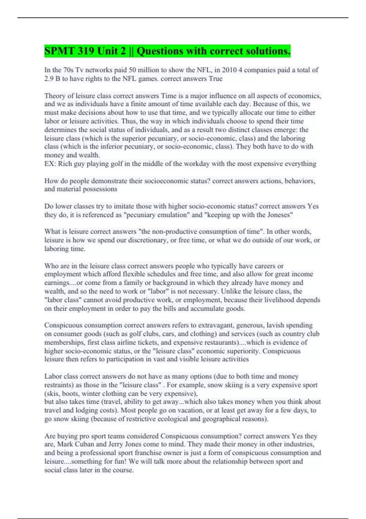 In the 70s Tv networks paid 50 million to show the NFL, in 2010 4 companies paid a total of 2.9 B to have rights to the NFL games. correct answers True Theory of leisure class correct answers Time is a major influence on all aspects of economics, and we as individuals have a finite amount of time available each day. Because of this, we must make decisions about how to use that time, and we typically allocate our time to either labor or leisure activities. Thus, the way in which individuals choose to spend their time determines the social status of individuals, and as a result two distinct classes emerge: the leisure class (which is the superior pecuniary, or socio-economic, class) and the laboring class (which is the inferior pecuniary, or socio-economic, class). They both have to do with money and wealth. EX: Rich guy playing golf in the middle of the workday with the most expensive everything How do people demonstrate their socioeconomic status? correct answers actions, behaviors, and material possessions Do lower classes try to imitate those with higher socio-economic status? correct answers Yes they do, it is referenced as "pecuniary emulation" and "keeping up with the Joneses" What is leisure correct answers "the non-productive consumption of time". In other words, leisure is how we spend our discretionary, or free time, or what we do outside of our work, or laboring time. Who are in the leisure class correct answers people who typically have careers or employment which afford flexible schedules and free time, and also allow for great income earnings....or come from a family or background in which they already have money and wealth, and so the need to work or "labor" is not necessary. Unlike the leisure class, the "labor class" cannot avoid productive work, or employment, because their livelihood depends on their employment in order to pay the bills and accumulate goods. Conspicuous consumption correct answers refers to extravagant, generous, lavish spending on consumer goods (such as golf clubs, cars, and clothing) and services (such as country club memberships, first class airline tickets, and expensive restaurants)....which is evidence of higher socio-economic status, or the "leisure class" economic superiority. Conspicuous leisure then refers to participation in vast and visible leisure activities Labor class correct answers do not have as many options (due to both time and money restraints) as those in the "leisure class" . For example, snow skiing is a very expensive sport (skis, boots, winter clothing can be very expensive), but also takes time (travel, ability to get away...which also takes money when you think about travel and lodging costs). Most people go on vacation, or at least get away for a few days, to go snow skiing (because of restrictive ecological and geographical reasons). Are buying pro sport teams considered Conspicuous consumption? correct answers Yes they are, Mark Cuban and Jerry Jones come to mind. They made their money in other industries, and being a professional sport franchise owner is just a form of conspicuous consumption and leisure....something for fun! We will talk more about the relationship between sport and social class later in the course.