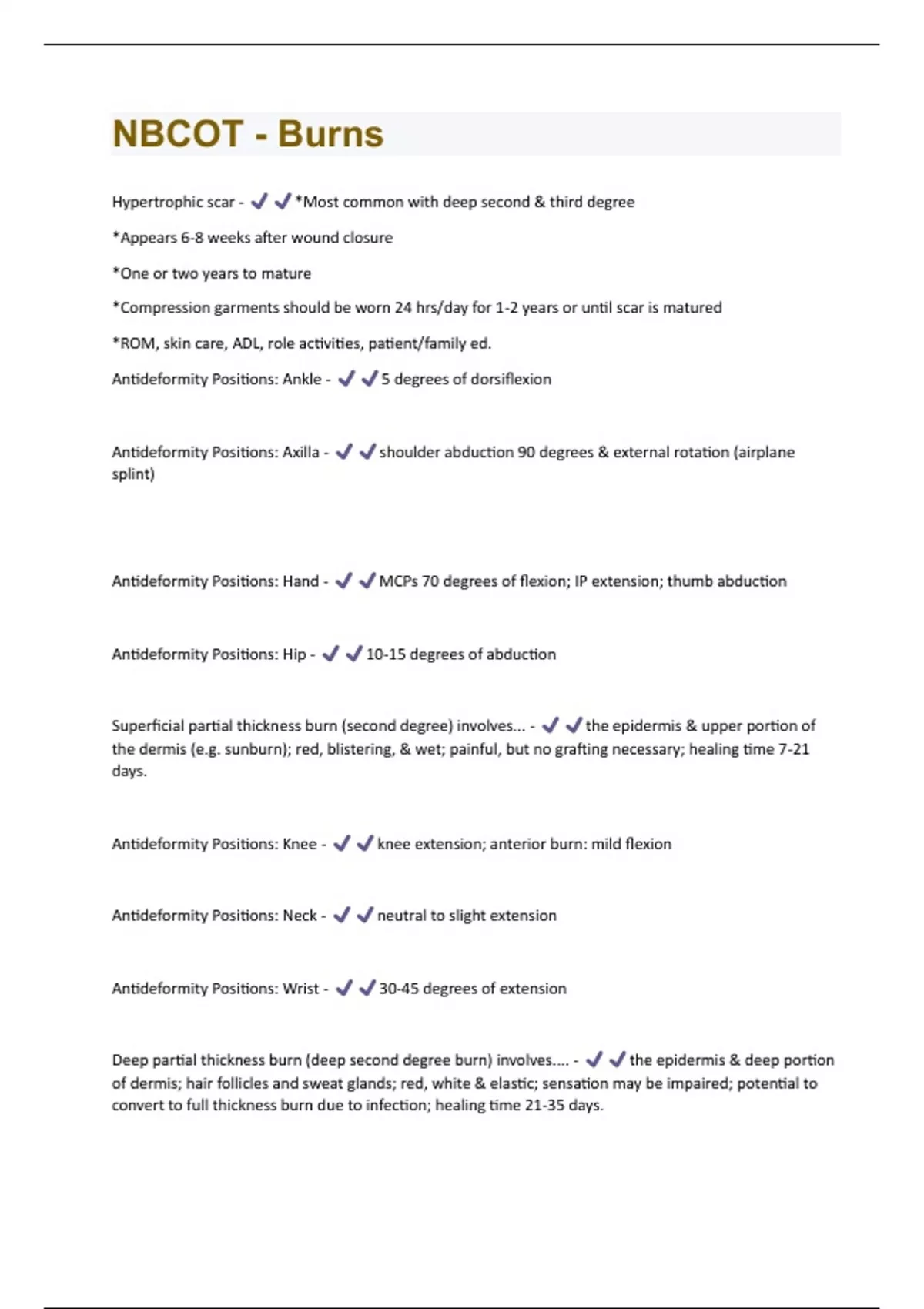 Antideformity Positions: Knee - knee extension; anterior burn: mild flexion