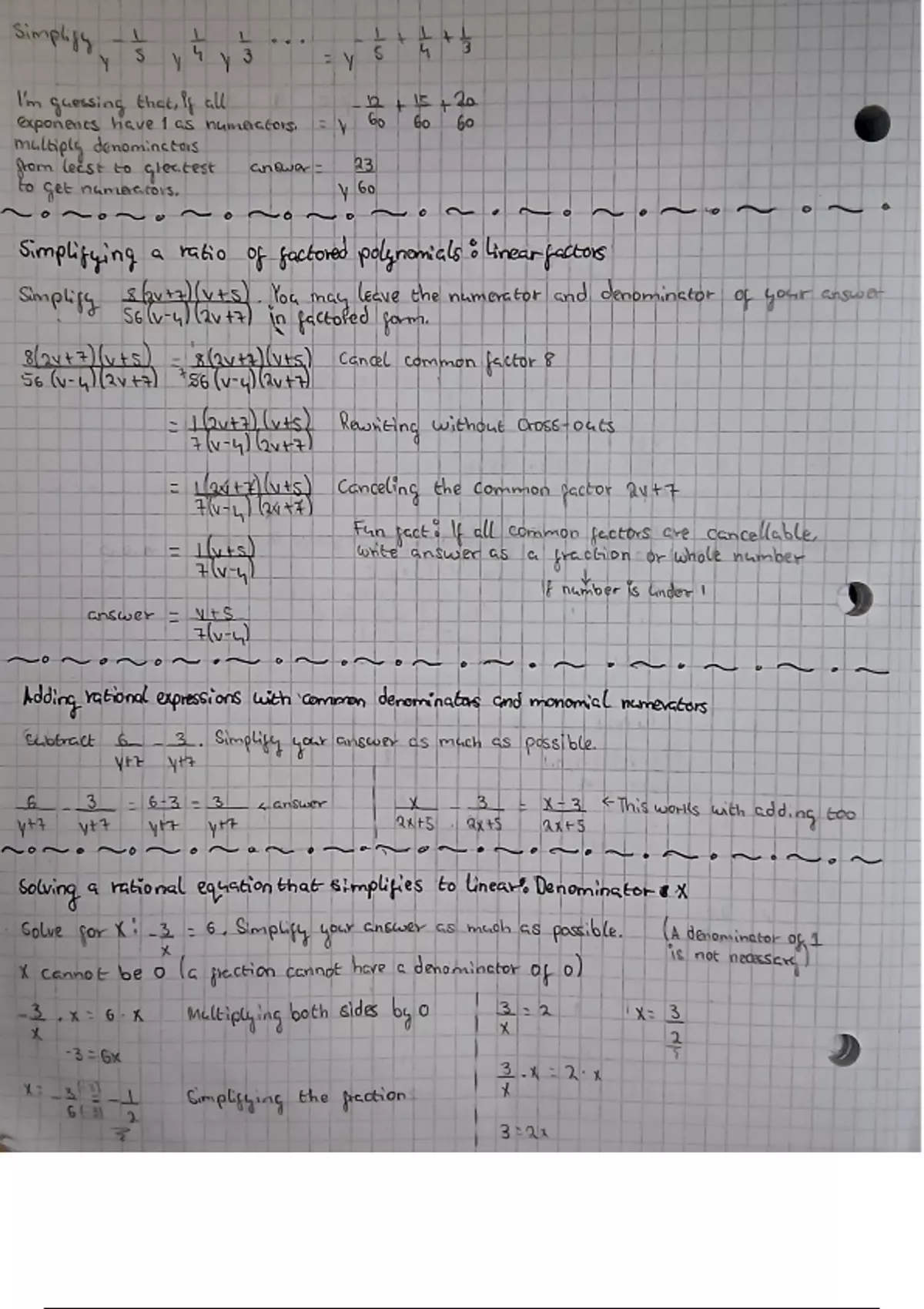 Simplifying a ratio of factored polynomials | Linear factors | Adding rational expressions with common denominators and monomial numerators | Solving a rational equation that simplifies to linear | Denominator X