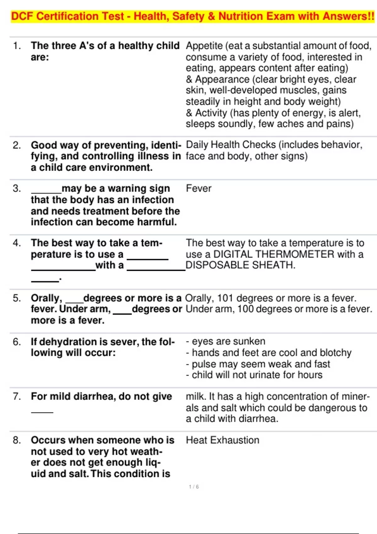 DCF Certification Test - Health, Safety & Nutrition Exam with Answers!!